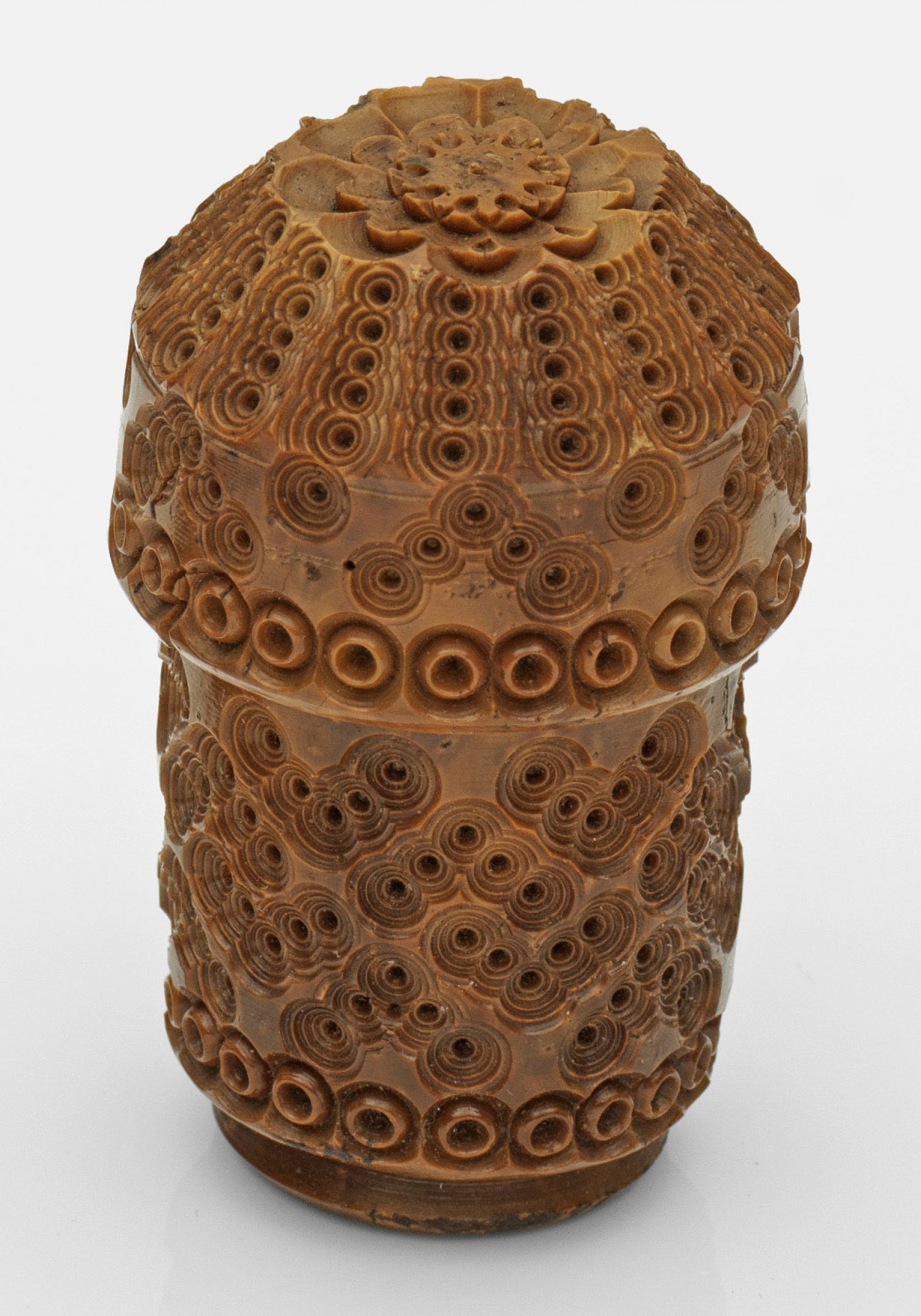 Kleine Buchsbaumdose Buchsbaum geschnitzt. Über flachem Stand zylindrischer Korpus. Wandung und konischer Schraubdeckel umzogen von dekorativ geometrisch angeordneten Kreisornamenten Deckelabschluss in Form einer stilisierten Blüte. Kleiner Spannungsriss. H. 6 5 cm.