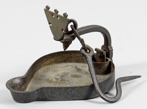 Bergmannslampe sog. Frosch. Offen für Fettbrand. Länglich birnförmiger gegossener Lampentopf mit Dochtschnauze und Trageöse. Gebogener Tragebügel in einem dreieckigen Schild aus Messing in drei Kreuzen endend. An einer kurzen Kette ein Haken zum Einhängen der Lampe. H. 13 5 cm.