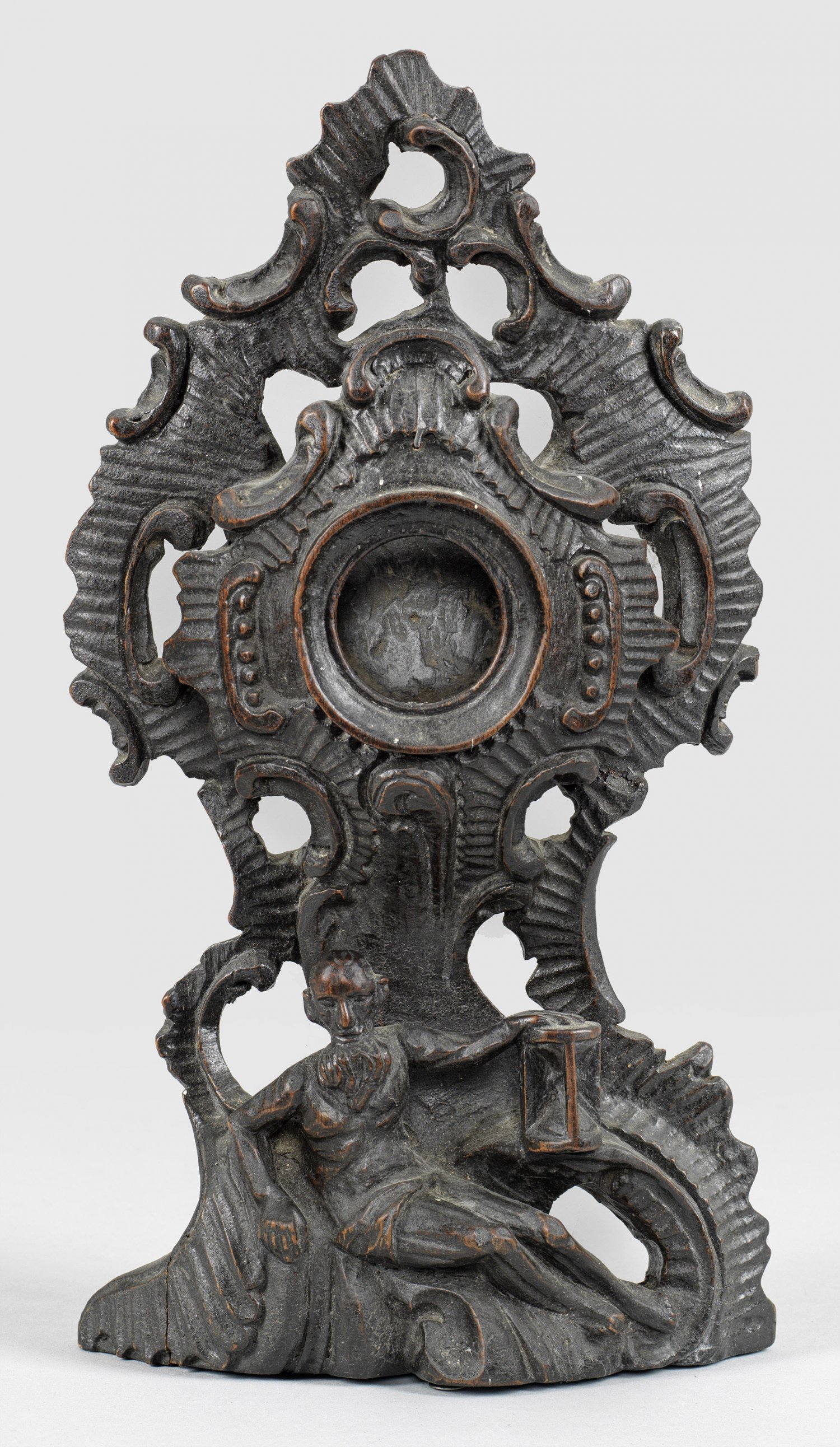 Rokoko-Taschenuhrenhalter mit Chronos-Figur Lindenholz, reliefplastisch geschnitzt und ebonisiert, rücks. abgeflacht. Geschweiftes, teilw. durchbrochen gearbeitetes Objekt in Rocaillenform. Auf dem Sockel ein ruhender Chronos in Gestalt eines älteren, bärtigen Mannes mit Stundenglas als Allegorie bzw. Personifikation der Zeit; oberhalb eine runde, profilierte Sichtöffnung für die Taschenuhr. Ein kleines Sockelstück rest.