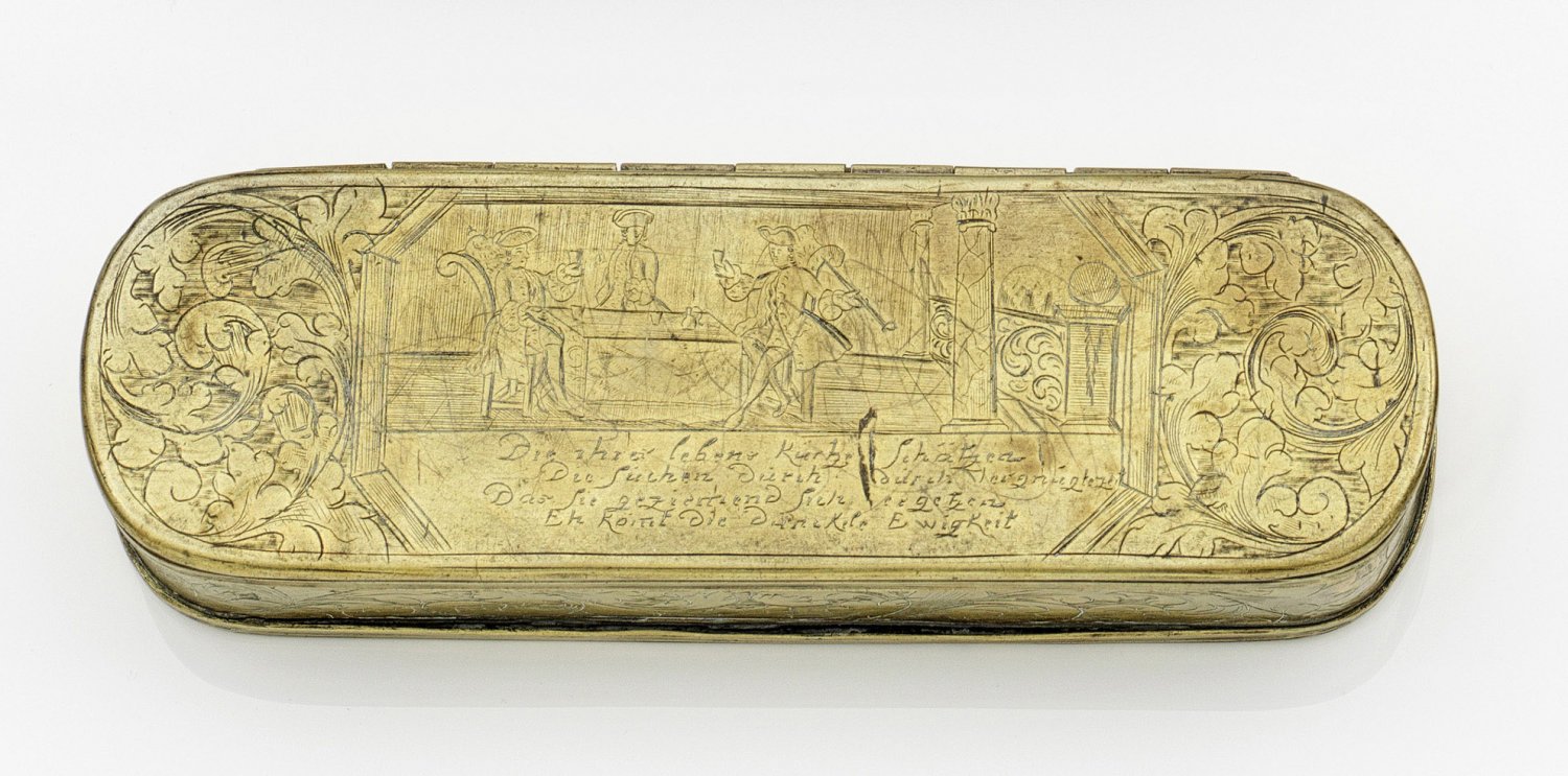 Tabakdose Messing gravierter Reliefdekor. Oblonge Form. Scharnierter Deckel und Bodenunterseite mit Darstellungen einer trinkenden und rauchenden Herrenrunde sowie eines musizierenden Paares je mit Inschrift. Wandung und Ränder mit üppigen Blattvoluten verziert. Altersgemäße Gebrauchsspuren. H. 3 2 cm. 16 cm x 4 8 cm.