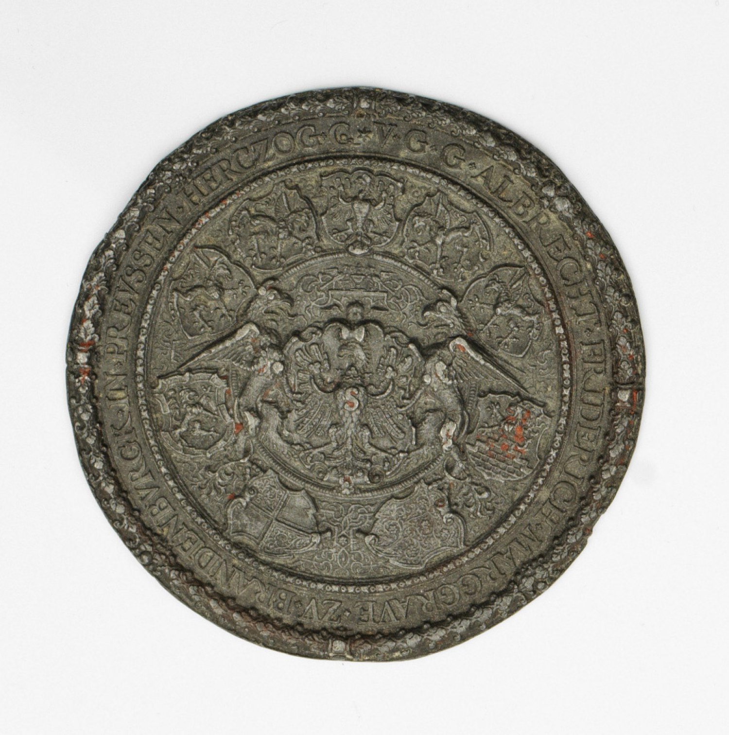 Zinn, reliefplastisch gegossen. Im Zentrum preußischer Adler mit Initiale "S" des Lehnsherrn Sigismund I. von Polen, umgeben von neun Wappenfeldern sowie Umschrift "Herczog C.V.G. C. Albrecht Friderich Marggrave zu Brandenburck in Preussen". D. 8,3 cm.