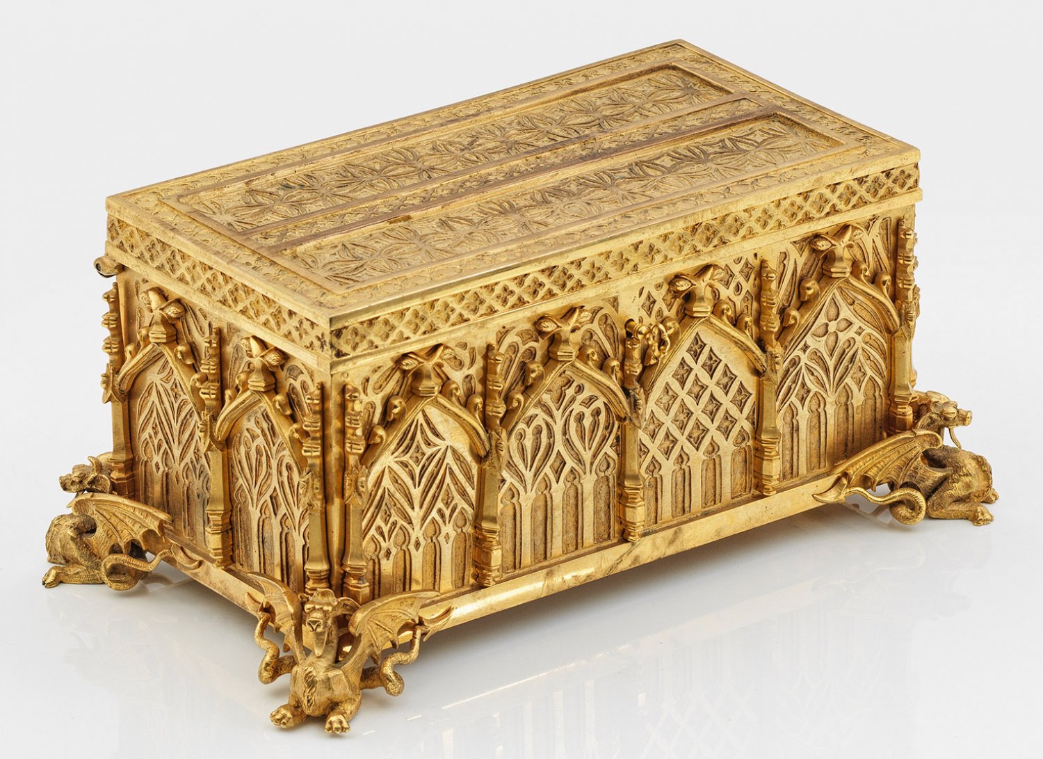 Bronze-Schatulle Bronze vergoldet. Rechteckige Truhenform auf vier vollplastischen Drachenfüßen. Seiten umlaufend mit gotischen Maßwerkfenstern verziert. Der Deckel seitlich mit Vierpassfries auf der Oberseite mit Kleeblattfries eingefasst. Innenfelder mit Blumenarabesken verziert. Schlüssel vorhanden. Hochwertige sehr feine Ausführung nach einem historischen Objekt des 15. Jhs. wie sie besonders in Sheffield von der Firma Elkington hergestellt wurden und als kostbare Dekoration in viktorianische Herrenhäuser oder als Museumsexponat in kunstgewerbliche Sammlungen wie dem Victoria & Albert Museum Eingang fanden und auf Weltausstellungen präsentiert wurden. H. 15 cm. 32 cm x 19 5 cm.