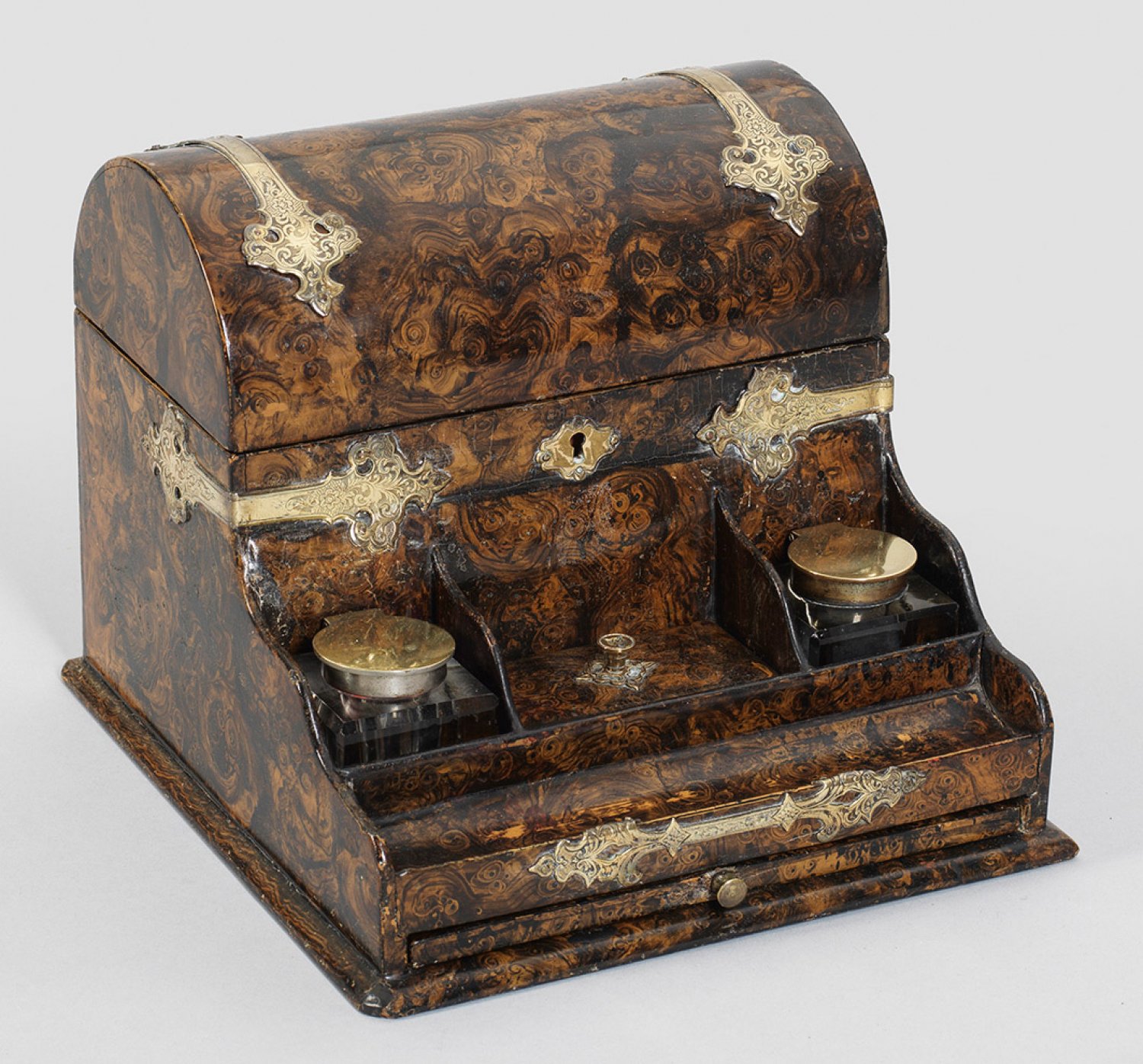 Reise-Schreibschatulle Holz polychrome Lackmalerei Walnußwurzelholz imitierend. In Form einer Runddeckeltruhe gearbeitete Aufbewahrung für Schreibpapier und Briefe mit frei vorgesetzter Einstellung für Tintenfässer und Deckelfach für Kleinutensilien sowie Federablage. Messingknauf des Deckels als Petschaft in Form eines Tierkopfes gearbeitet. Unten ausziehbare mit grünem Samt bezogene Schreibunterlage. Verziert mit fein gravierten Messingbeschlägen. Gebrauchsspuren. H. 18 5 cm. 23 cm x 23 5 cm.