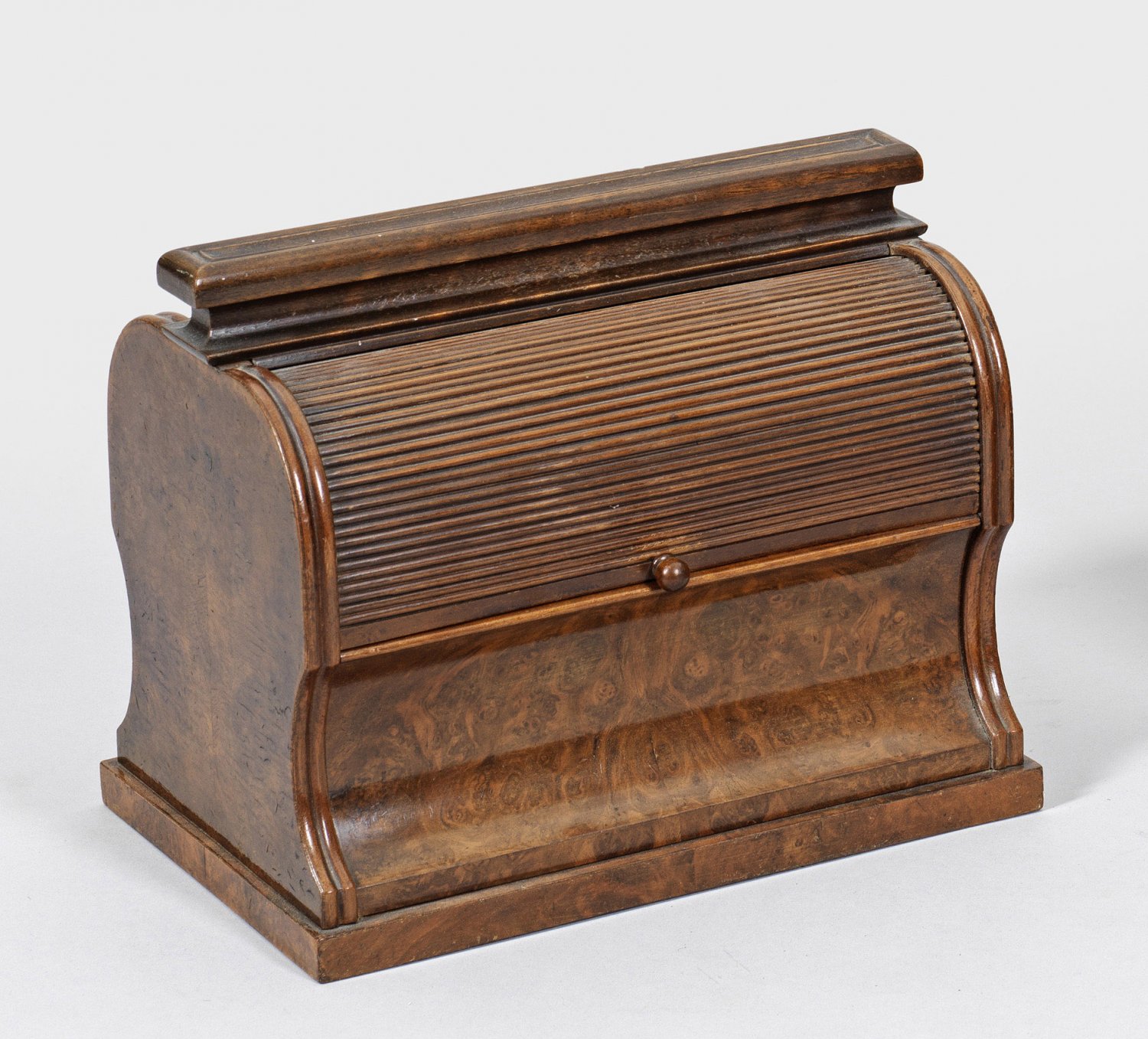 Viktorianische Schatulle für Briefpapier Nussbaummaser furniert. Korpus mit balusterförmigen Seitenwangen auf flacher Basis. Vorder- und Rückseite teilw. konkav eingezogen sowie Rolloverschluss. Inneneinteilung für Briefpapier und Umschläge. H. 21 5 cm. 26 5 cm x 17 5 cm.