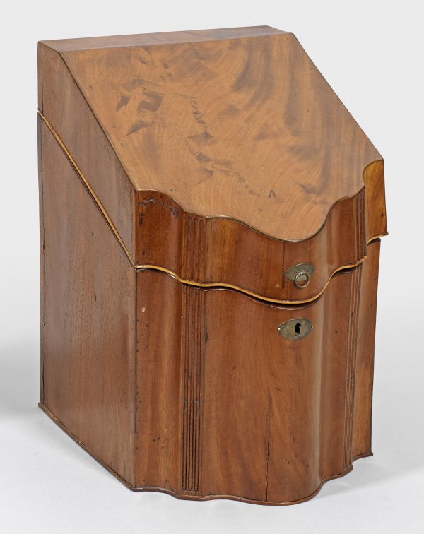 Regency-Besteckkasten Mahagoni furniert. Gerader in der Front mehrfach geschweifter Korpus mit entsprechendem schräggestelltem Deckel. Inneneinteilung für Besteckteile. H. 37 cm. 24 cm x 30 5 cm.
