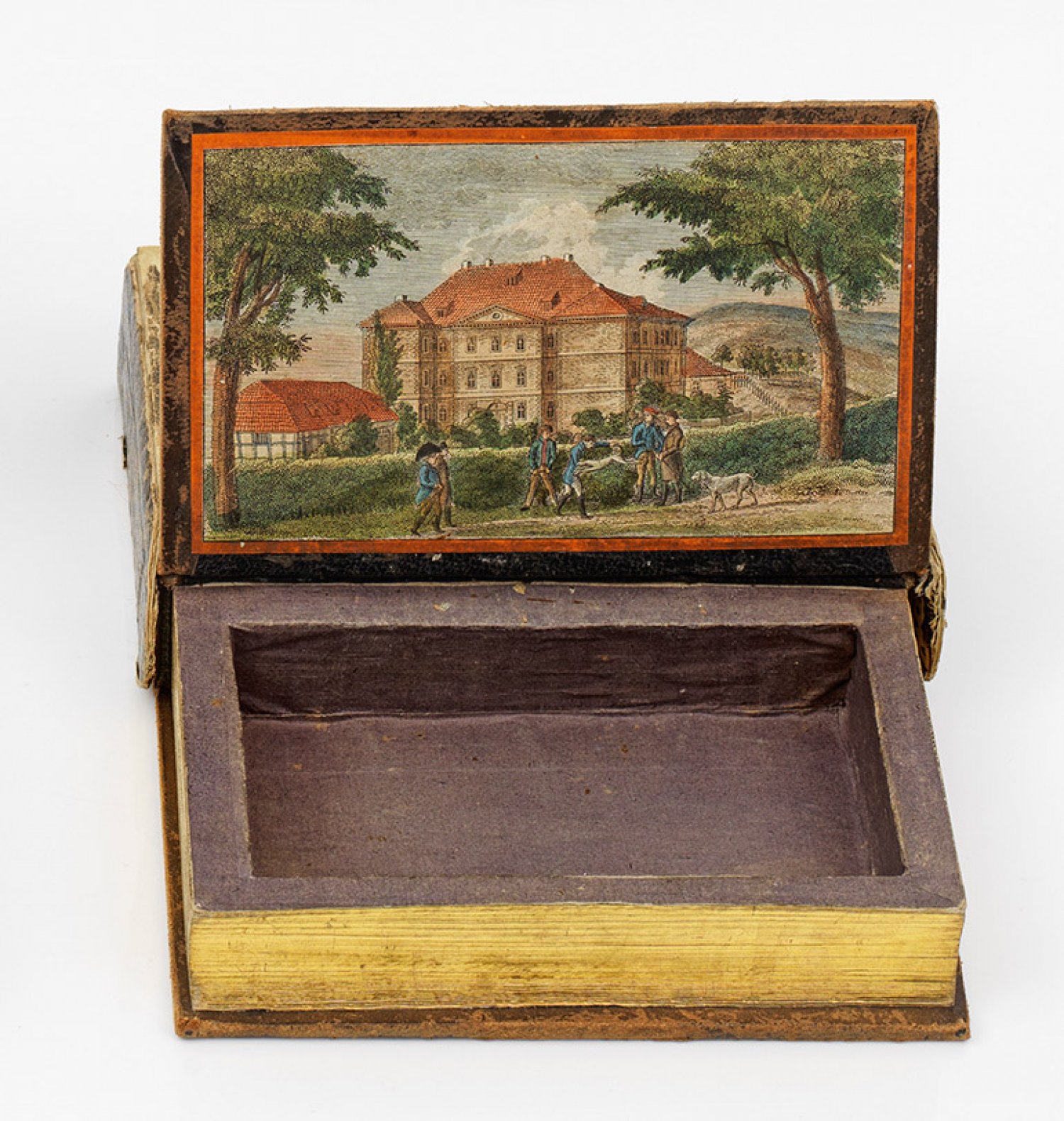 Schatulle Leder mit Goldprägung auf Karton. Betitelt "Der Schein trügt". Aufklappbare Rechteckform. Deckelinnenseite mit koloriertem Kufperstich einer figurenreichen Landschaft. Goldschnitt-Optik. Marmorierter Schuber. Altersgemäße Gebrauchsspuren. 14,5 cm. 10,5 cm x 3,5 cm.