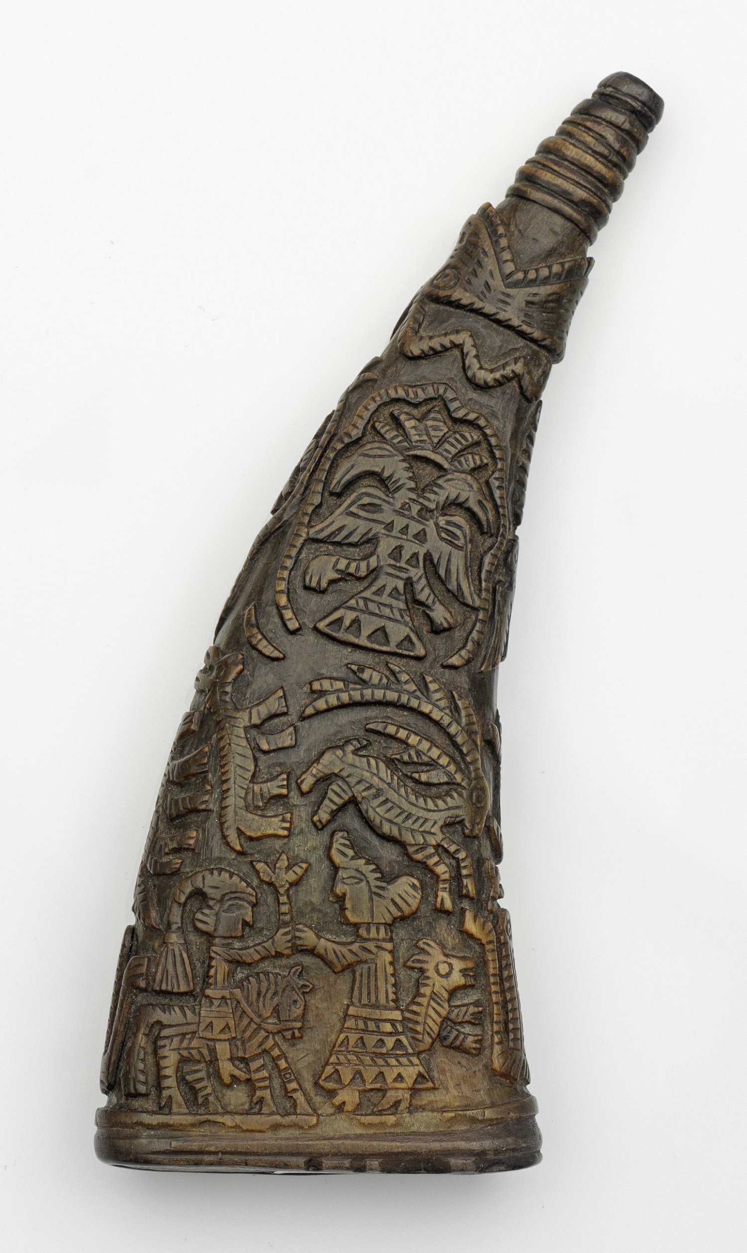Pulverflasche Wohl Steinbockhorn flach gepresst und geschnitzt. Mit eingesetztem Holzboden. Flächendeckende Darstellungen von Tieren Pflanzen und einem Mann zu Pferde einer Frau eine Blume überreichend. Der Übergang zur Tülle in Form eines Steinbocks geschnitzt und graviert. L. 21 cm.