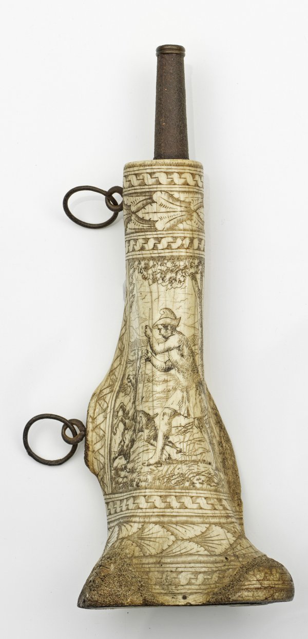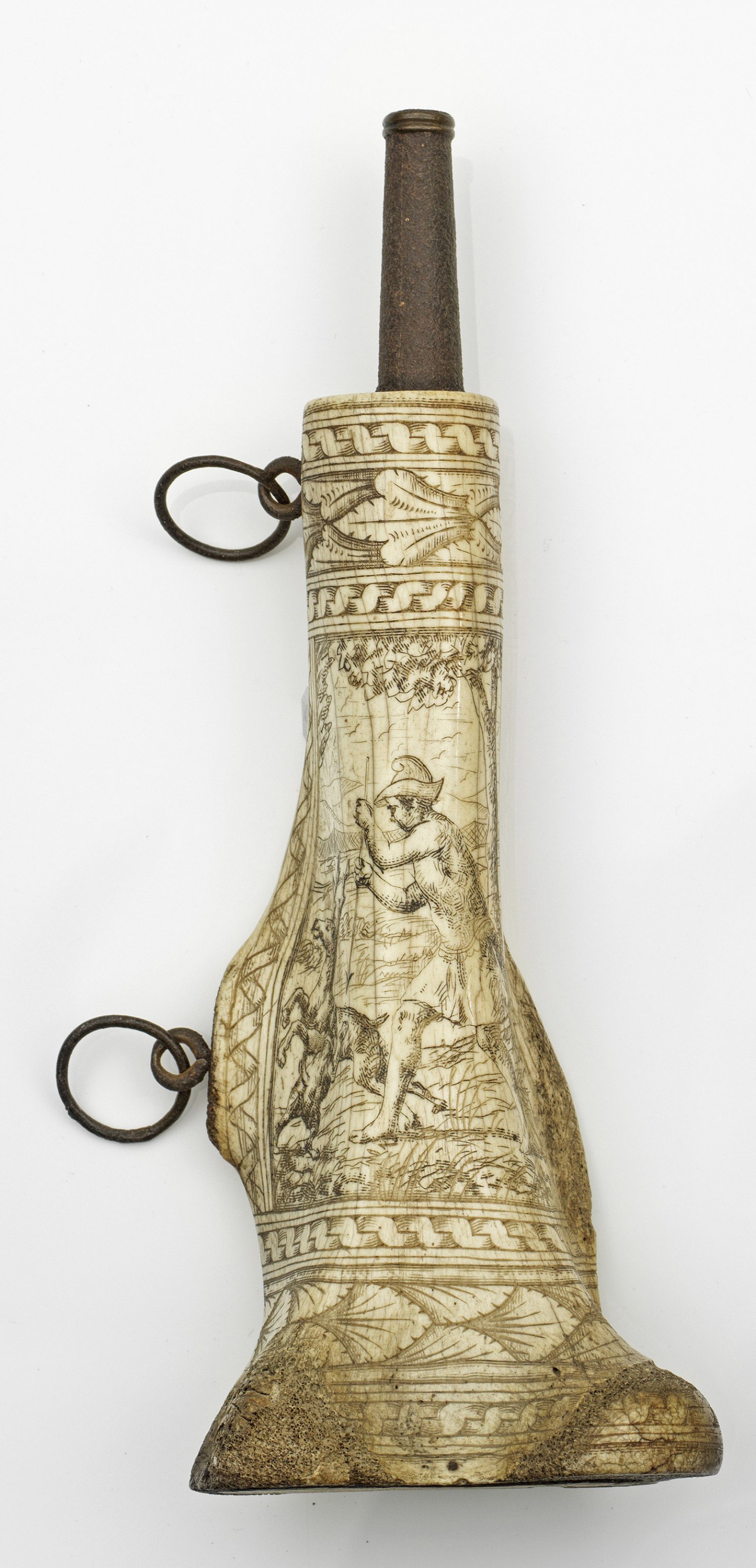 Pulverflasche Knochen und Eisen. Aus einem Rinderknochen gearbeiteter Korpus. Flächendeckend üppig graviert mit Blattdekor und symmetrischen Ornamentbändern. Zentrale, äußerst detailreich gestaltete Darstellung eines Jägers mit seinem Speer und Hund bei der Hirschjagd sowie Artemis, der Göttin der Jagd. Mit konisch zulaufender, eiserner Schütte und Holzboden. Seitlich zwei angebrachte Ösen mit Trageringen. Rückseitig besch.; H. 30,5 cm.