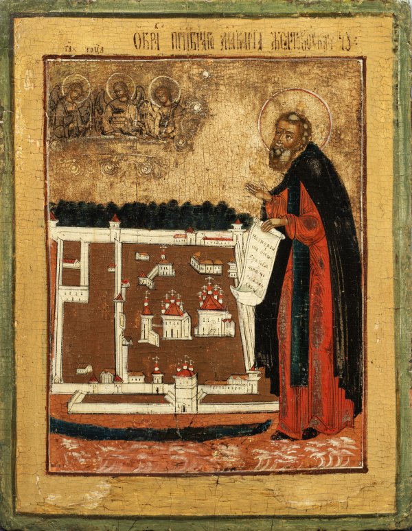Ikone "Makarios von Unzha" Temperamalerei mit wenig Gold auf Holz. Im Mittelfeld ganzfigurige Darstellung des Heiligen Makarios, in der linken Hand eine Schriftrolle haltend, mit der Rechten auf eine von ihm gegründete Klosteranlage weisend. In der linken oberen Ecke, von Wolkenband umzogene Darstellung der alttestamentischen Dreifaltigkeit. Kirchenslawisch bez.; Unw. rest.; 34 cm x 26 cm.
