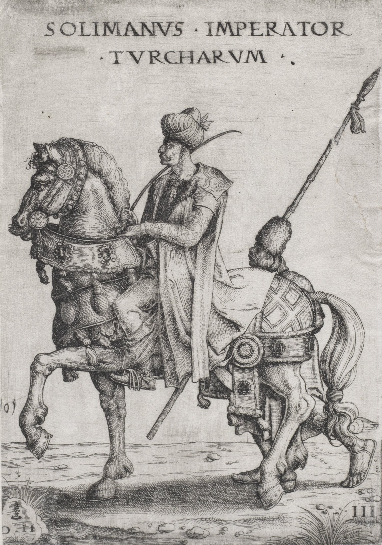 Eisenradierung/Papier. 1526-1536. Monogr. "D. H", Künstler-Symbol. Dargestellt ist Suleyman I. (1520-1566 zehnter Sultan des osmanischen Reiches) zu Pferde, neben ihm ein einfacher Fußsoldat mit Lanze. Das seltene Blatt stammt aus einer Folge von fünf Blättern mit Darstellungen osmanisch-türkischer Reiter nach 1526 geschaffenen Holzschnitten von Jan Swart van Groningen. Beschnitten, am rechten Rand oberhalb rest., auf Hinterlegkarton kaschiert. Blatt ca. 22 cm x 15 cm. Rahmen.