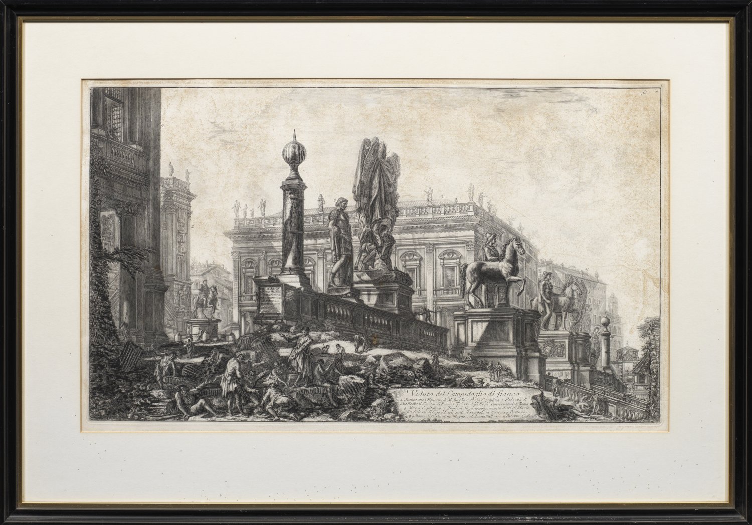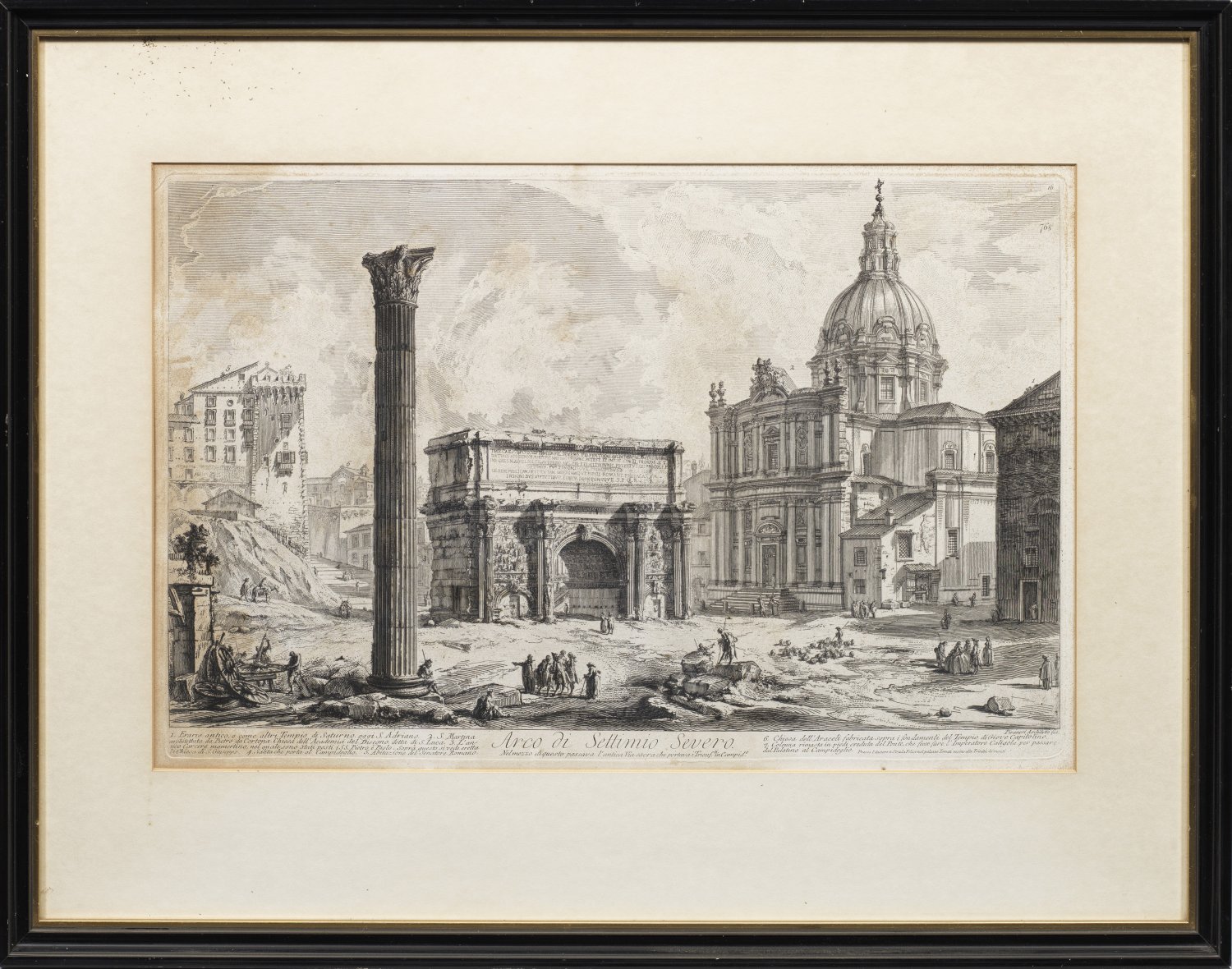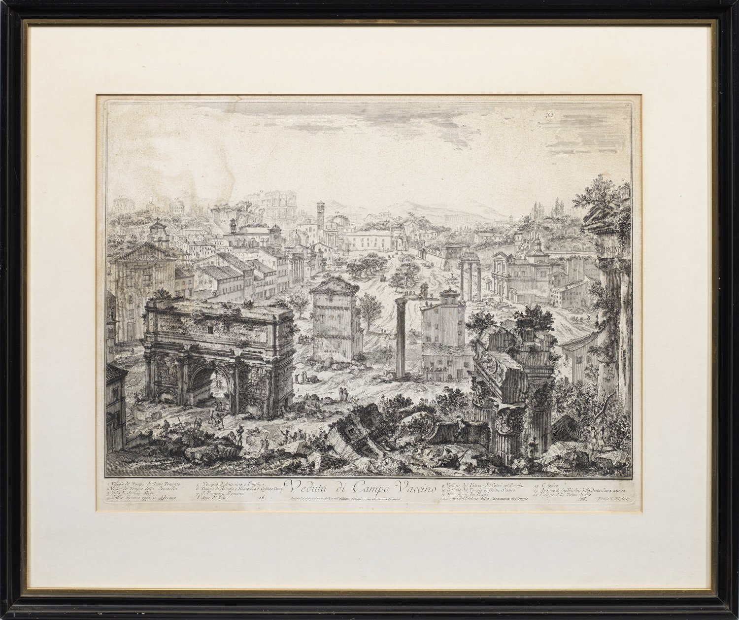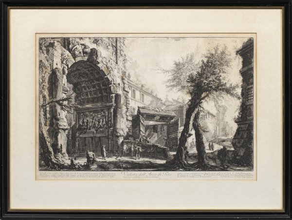 Radierungen/Bütten. Jeweils in der Platte sign. u. betitelt. "Veduta del Romano Campidoglio con Scalinata che via alla Chiesa d'Araceli", um 1747/48-1760; "Arco di Settimio Severo", 1759; "Veduta dell'Arco di Tito", um 1760; "Veduta di Campo Vaccino", 1775; "Veduta del Campidoglio di fianco", 1775. Dem Alter gemäß partiell fleckig. Plattenmaß ca. 37,5 cm-40,5 cm x 54,5 cm-68,5 cm. Rahmen.
