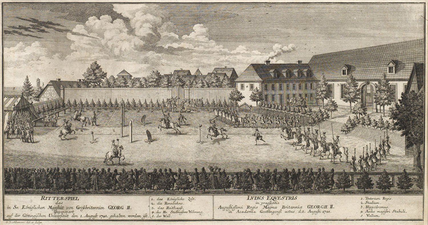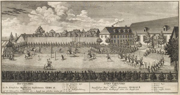 Copper engraving (and etching?) depicting the tournament for George II King of Great Britain held at the University of Göttingen, August 1748.
