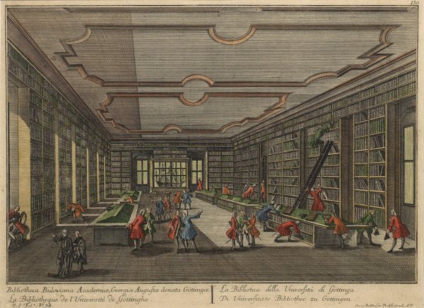 Altkolorierter Kupferstich von Georg Balthasar Probst (1732 - 1801), nach Georg Daniel Heumann, Augsburg, um 1760-1780. Unterhalb mehrsprachige Legende und Sign.; Blick in den durch eine reiche, phantasievolle Figurenstaffage belebten ersten Bibliotheksaal der neu gegründeten Universität, der 1734 in einem Saal des ehemaligen Pauliner-Klosters der Dominikaner eingerichtet wurde. Ca. 31 cm x 42,5 cm (Passepartoutausschnitt). Rahmen.