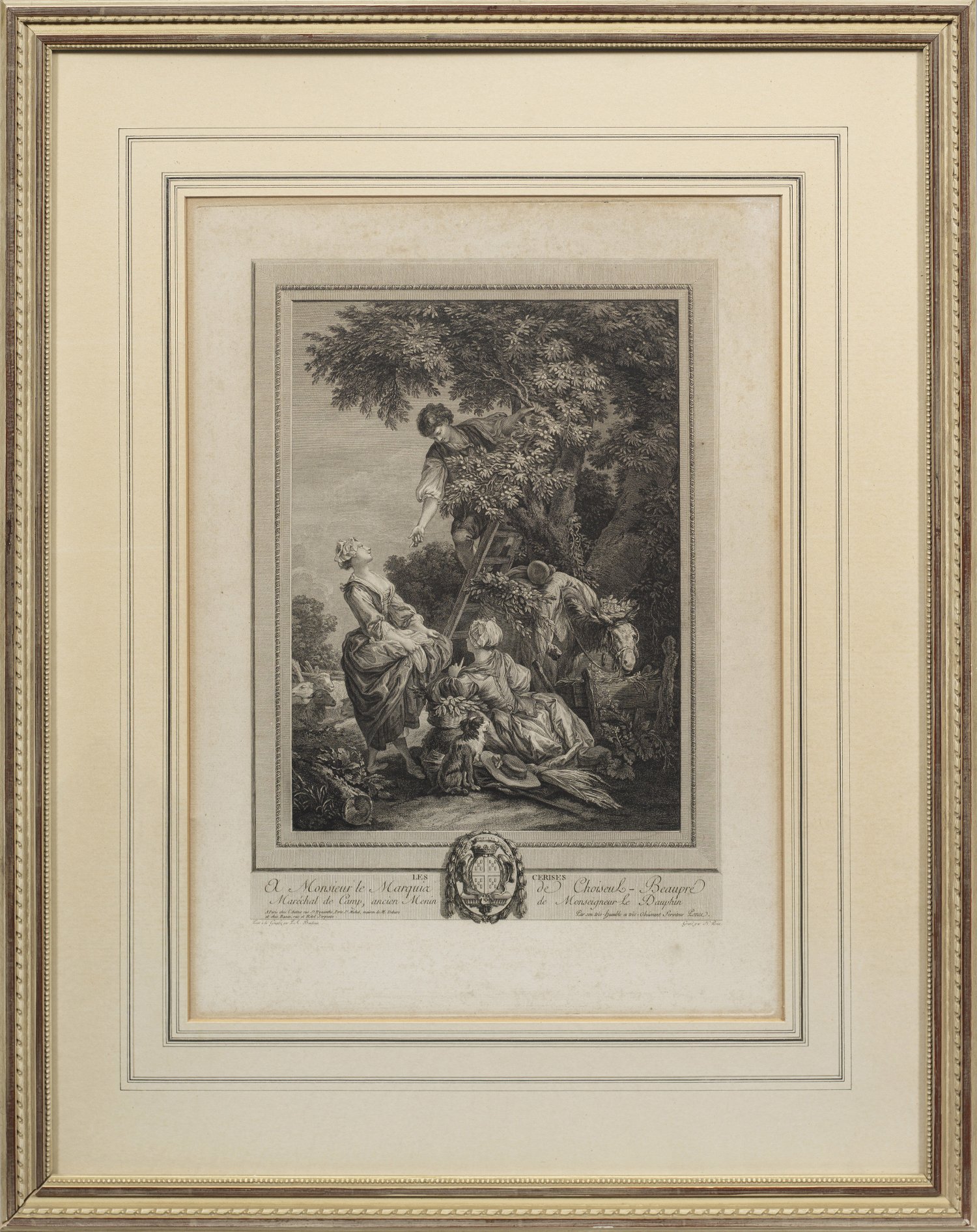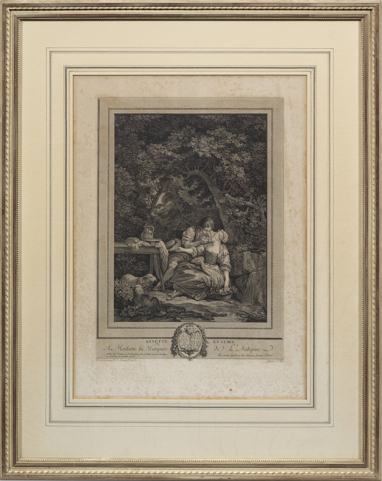 /V/Two sheets with copper engraviongs on paper, 1775. Signed and titled on the plate. After gouaches by Pierre-Antoine Baudouin (1723 - 1769). Foxing.