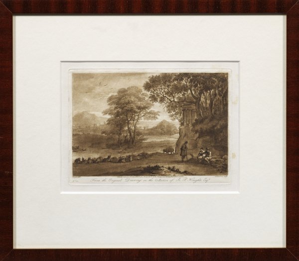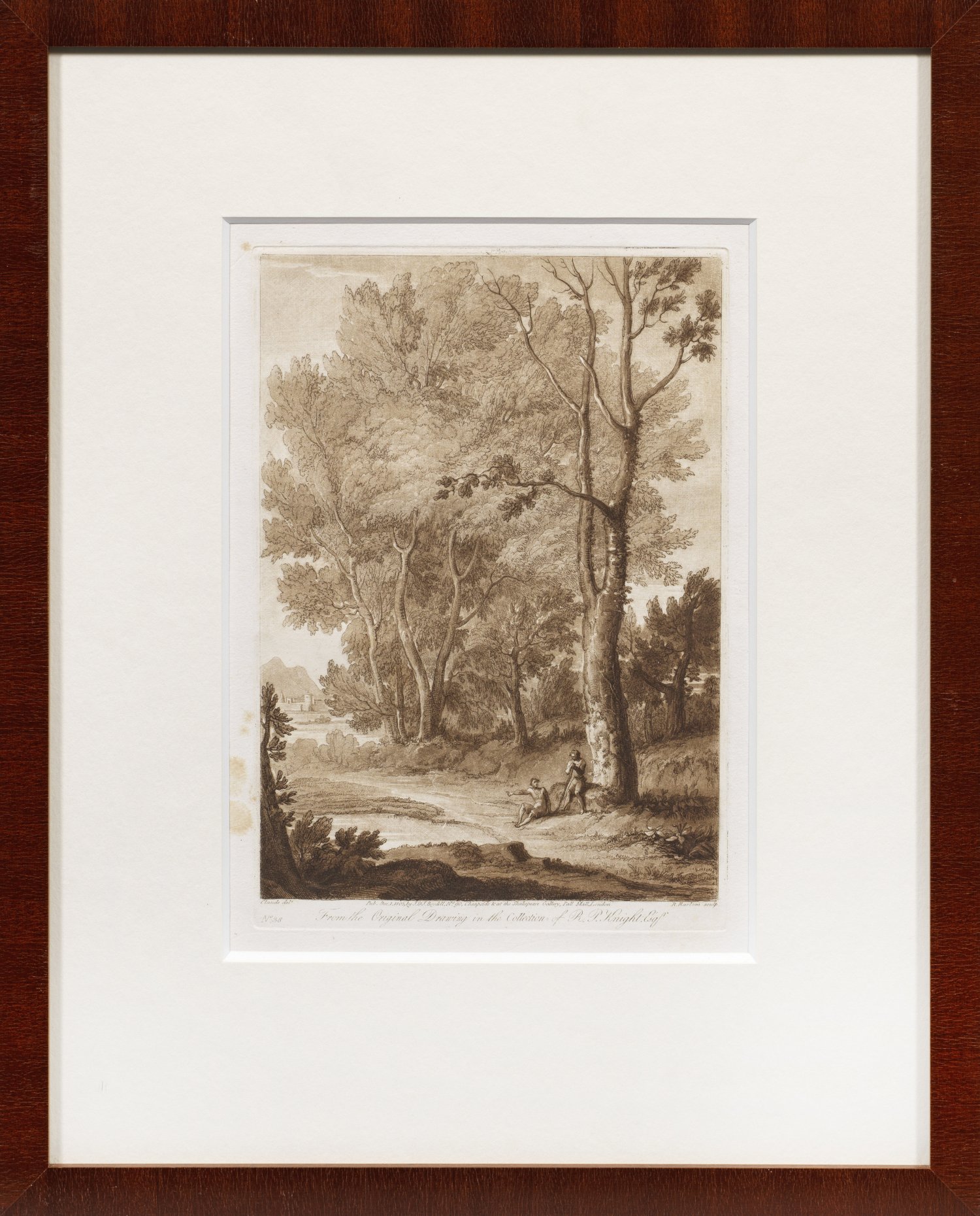 Two sepia printed mezzotints on paper after drawings by Claude Lorrain, 1803. Signed and inscribed in the plate "From the Original Drawing in the Collection of R. P. Knight, Esqr.". Published by J. & J. Boydell and Shakespeare Gallery, London, 1803.