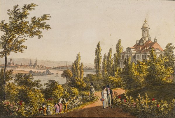 Dargestellt ist das 1811 fertig gestellte Palais des James Ogilvy, 7. Earl of Findlater (1750 - 1811) in Dresden-Loschwitz; 1821-1850 war es ein beliebtes Ausflugslokal, bis dort 1861 die drei "Elbschlösser" erbaut wurden.