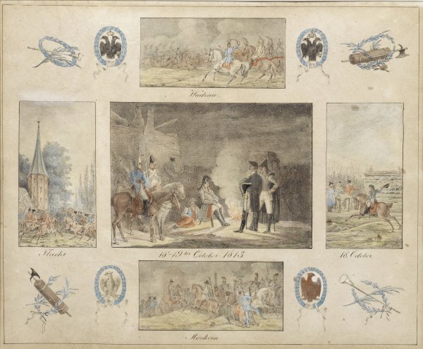 Altkolorierte Lithographie. Fünf rechteckige Bildfelder mit Darstellungen des Gefechts bei Möckern (am 05.04.1813) der Schlacht bei Wachau (am 16.10.1813) als Teil der Völkerschlacht bei Leipzig (16.-19.10.1810) und infolge der Niederlage und Flucht Napoleons. In den Zwickeln u. a. Liktorenbündel und Napoleonischer Adler. Gebräunt ger. fleckig. 31 5 cm x 39 cm (Passepartoutausschnitt). Rahmen.