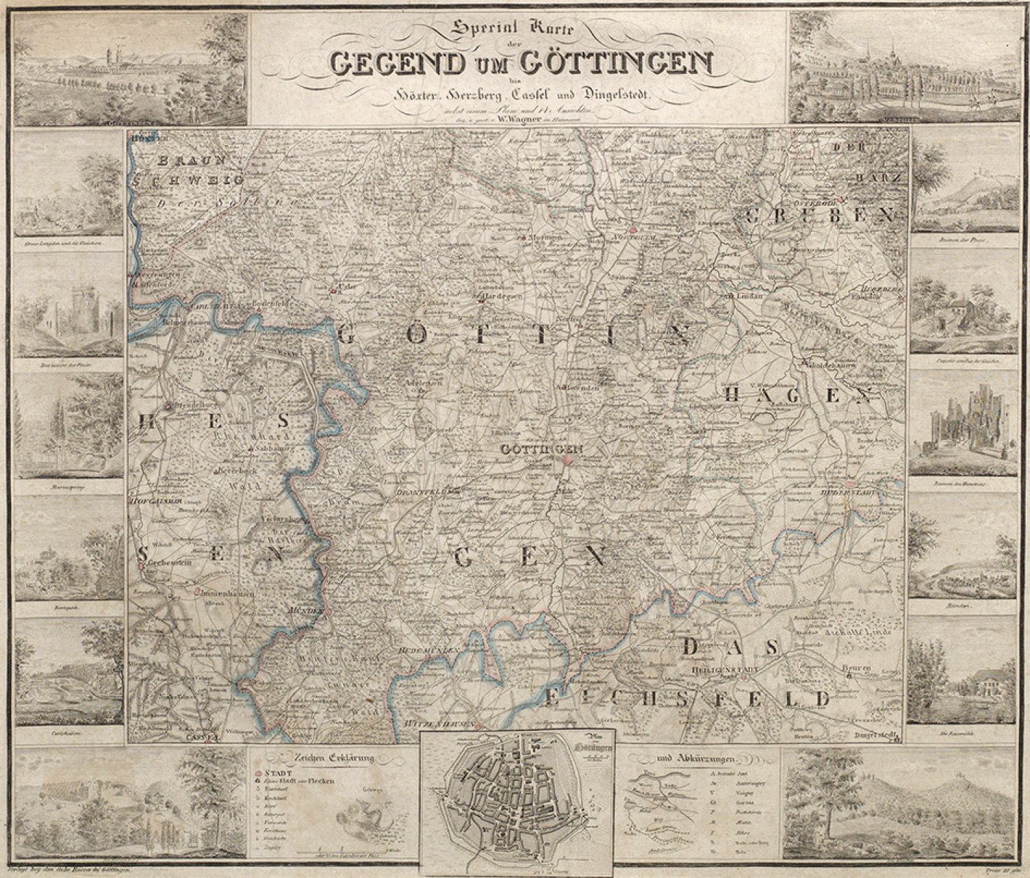 "Special-Karte der Gegend um Göttingen bis Höxter, Herzberg, Cassel und Dingelstedt. Nebst einem Plane und 14 Ansichten". Originaltitel