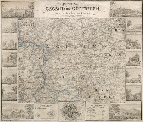 A steel engraved map of the surrounding of Göttingen with 14 views published in 1826.