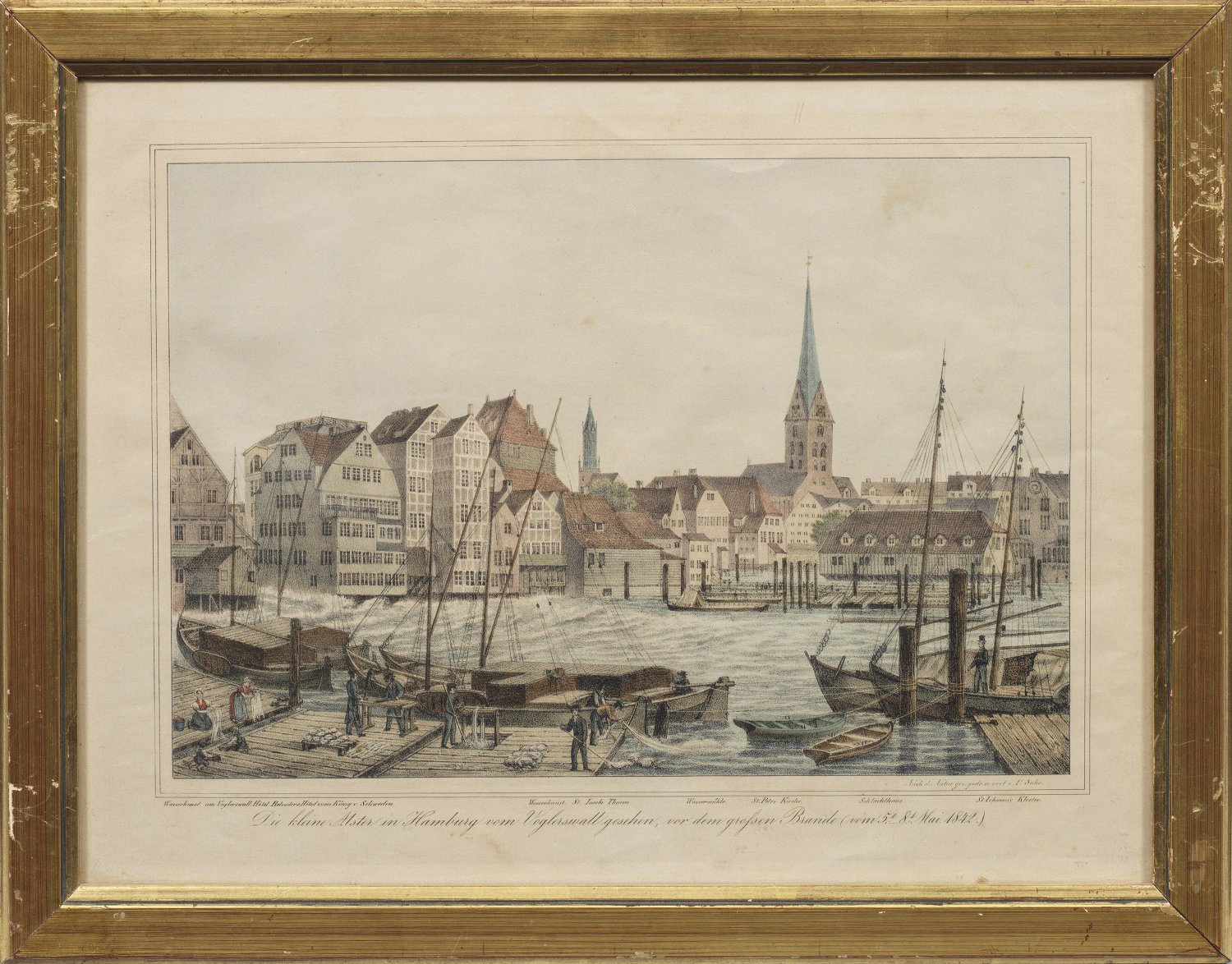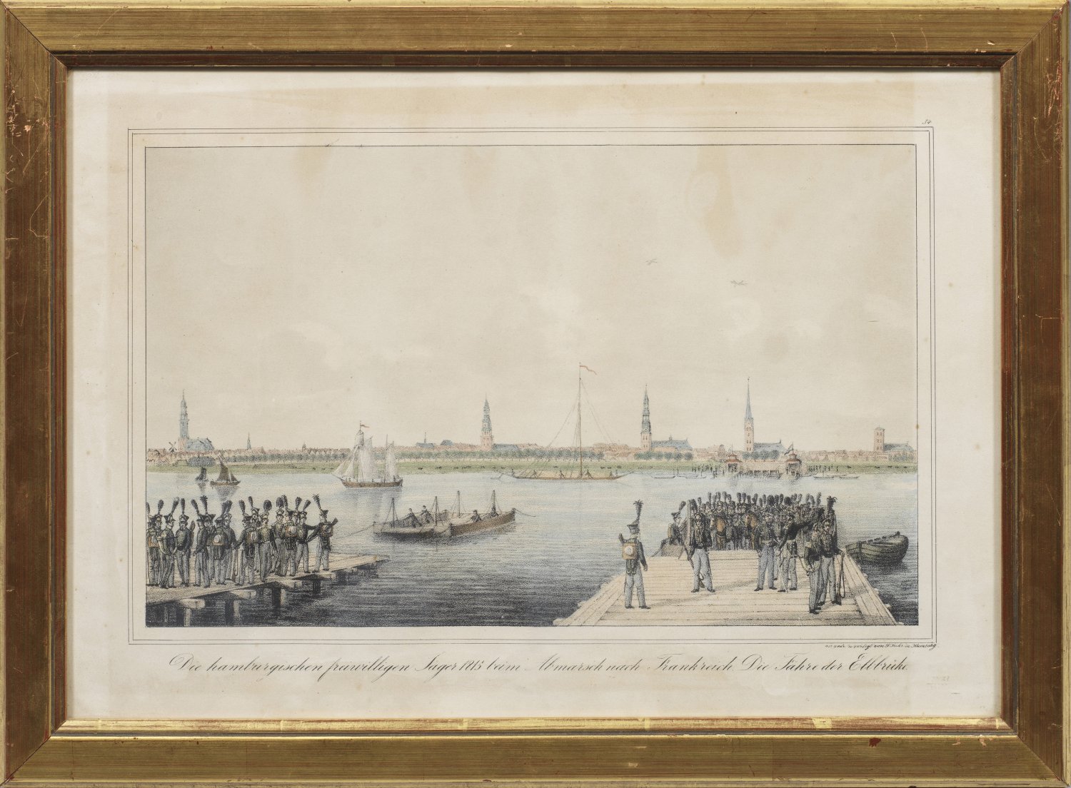 "Die hamburgischen freiwilligen Jäger beim, Abmarsch nach Frankreich (/) Die Fähre der Elbrücke" und "Die kleine Alster in Hamburg vom Voglerswall gesehen, vor dem großen Brande (vom 5t-8t Mai 1842.)" (Originaltitel). Altkolorierte Lithographien/Papier. Jeweils im Stein sign. sowie mit Betitelung bzw. Legende, Druck u. Verlag Peter Suhr, Hamburg. Blätter ca. 29 cm-31 cm x 41 cm. Rahmen.