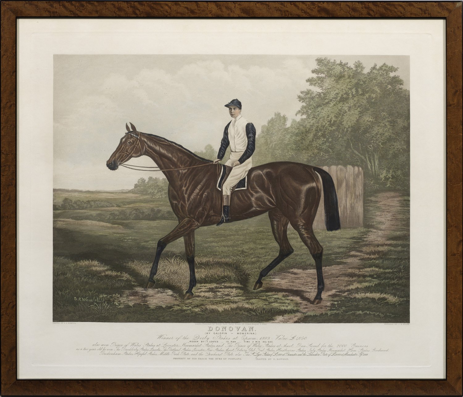 Altkoloriertes Aquatinta-Blatt/Papier, 1889. Nach einem Gemälde von Sydney R. Wombill (1857-1916). Zeigt einen Jockey auf dem berühmten Vollblut-Rennpferd Domovan (1886 - 1905) nach Gewinn des Derbys von 1889. In der Platte sign. u. betitelt mit ausführlicher Legende. Plattenmaß ca. 58 cm x 70 cm. Rahmen.