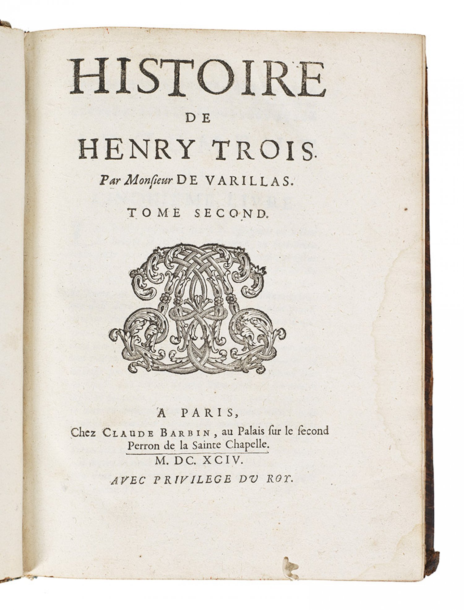 Antoine Varillas: "Histoire de Henry Trois" Originaltitel Antoine Varillas: Histoire de Henry Trois. Edition Claude Barbin, Paris 1694. Bd.1 583 S.; Bd. 2 503 und 389 S. In französischer Sprache. Originaler Ledereinband mit geprägtem Buchrücken. Best., handschriftliche Vermerke. 26 cm x 19,5 cm.