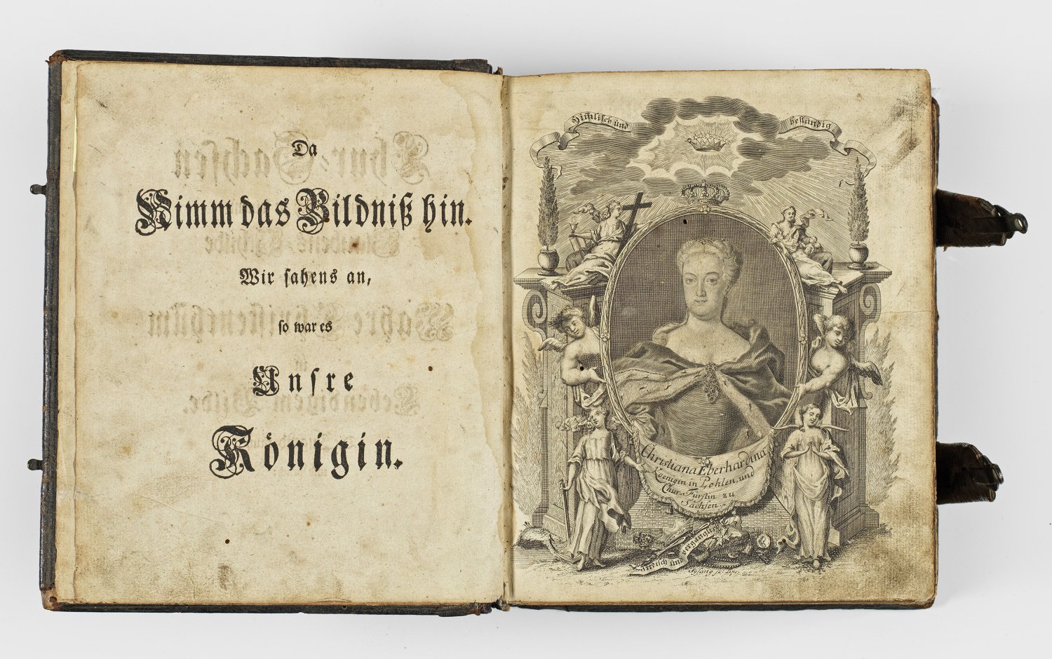 Johann Arndt "Khur-Sachsen wünschte sich zu seinem Glaubens-Schilde das wahre Christentum in lebendigem Bilde...". Verlegt von Johann Samuel Heinlius, Leipzig um 1750. Frontispiz mit Portrait-Tafel der Königin Christiana Eberhardina von Polen und Kurfürstin zu Sachsen, sign. Sysang. Zahlreiche ganzseitige Kupferstiche. Geprägter Ledereinband mit Messingschließen. Seiten fehlen, teilw. stockfleckig. Nicht kollationiert. 22 cm x 18,5 cm.