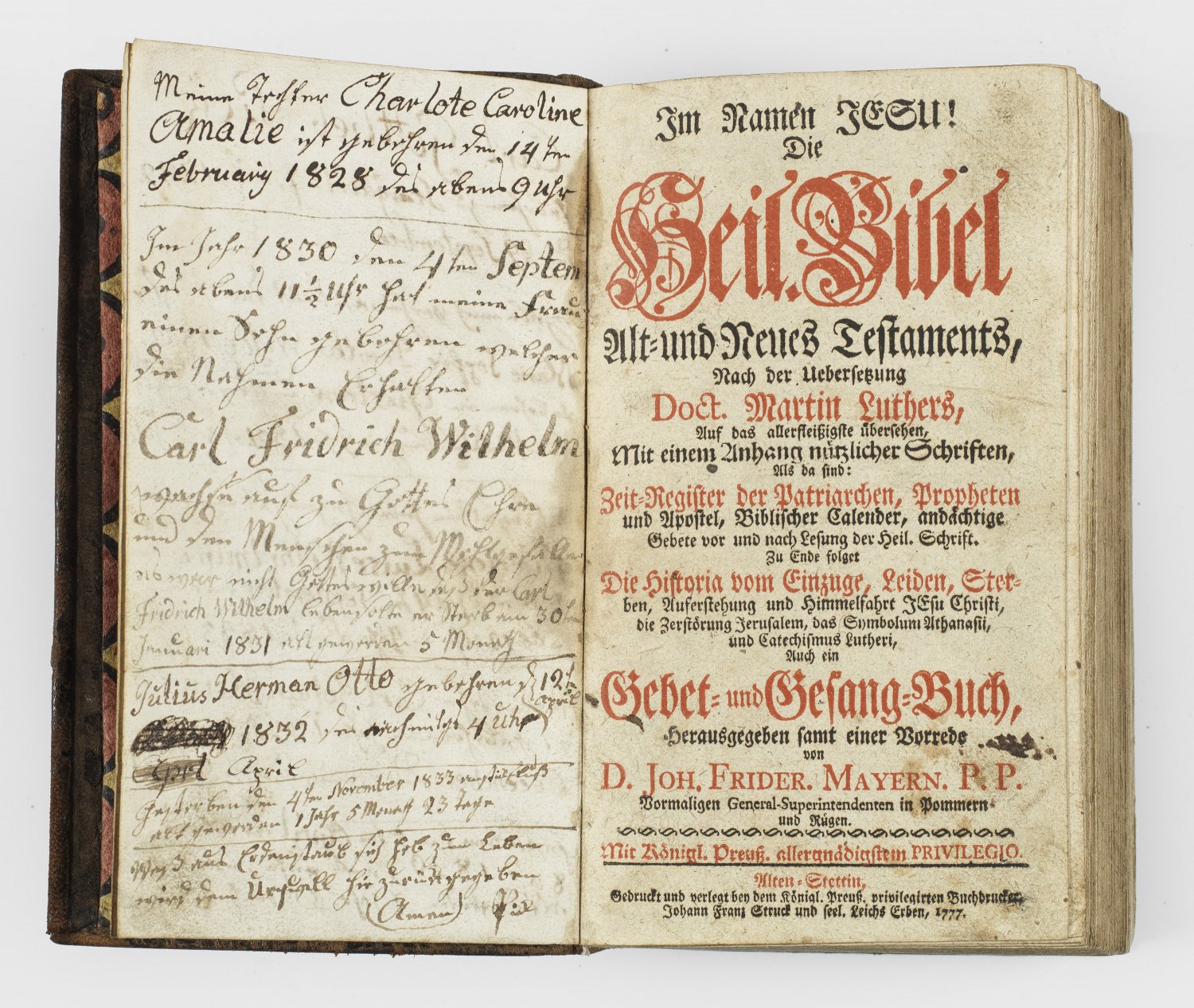 Luther-Bibel "Die Heil. Bibel Alt und Neues Testaments, nach der Übersetzung Doct. Martin Luthers". Hrsg. Johann Friedrich Mayer, Alten-Stettin. Druck und Verlag Johann Franz Struck & seel. Leichs Erben, 1777. Mit biblischem Kalender und Register. Im Vorsatz diverse Einträge der ehemaligen Besitzerfamilie 1782 - 1841. Goldschnitt. Geprägter Ledereinband mit undeutlichen Initialien unter adeliger Krone. Teilw. stockfleckig. Nicht kollationiert. 19,5 cm x 11 cm.