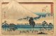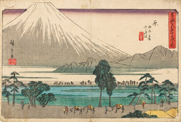 Drei Holzschnitte Katsushika Hokusai (1760-1849) Farbholzdruck auf Papier. Drei szenische Darstellungen aus der Serie der 36 Ansichten der Fuji: "Von Reisenden, Wanderern und Landarbeitern im Hintergrund der majestätische Berg Fuji". Siegel-Sign. und schwarze Kalligraphien. 22,5/24 cm x 36/36,6 cm.