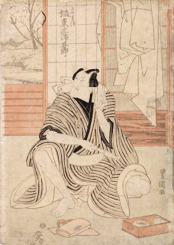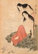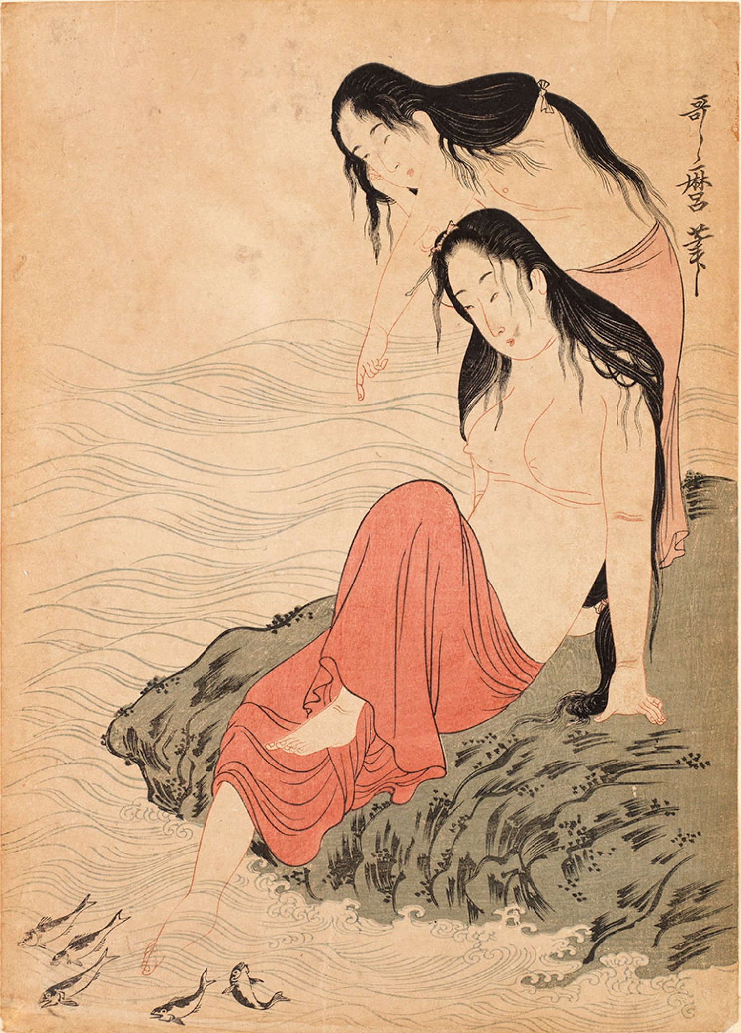 Zwei Japanische Holzschnitte Utagawa Toyokuni I (1769-1825) Farbholzdruck auf Papier. Szenische Darstellungen von "Sitzender Mann mit Opiumpfeife" und "Jungen Damen am Flussufer". Siegel-Sign. und schwarze Kalligraphien. Partiell Spuren von Wurmfraß. 37,5 cm x 26 cm.