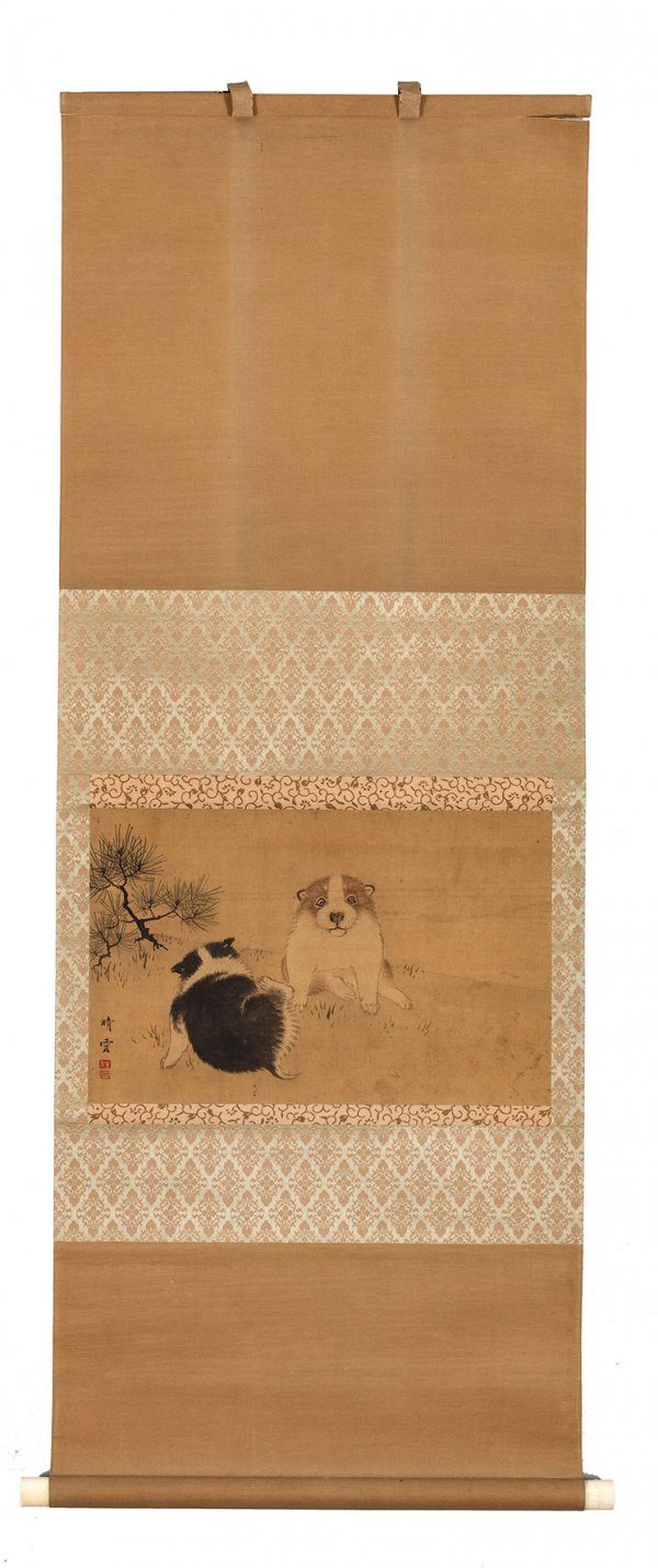 Chinesisches Rollbild Stilisierte Gartenlandschaft mit Kiefernbaum und szenischen Darstellungen von zwei kleinen Hunden. Tuschfederzeichnung auf Seide teilw. laviert. Links unten Kalligraphien sowie rote Siegel-Sign. L. 126 cm x 47 cm.