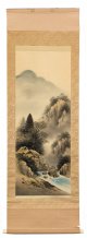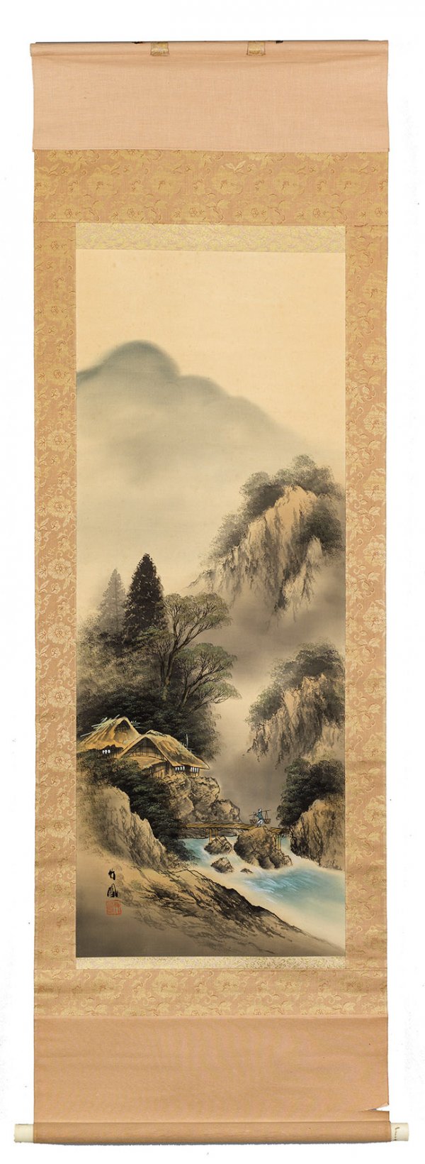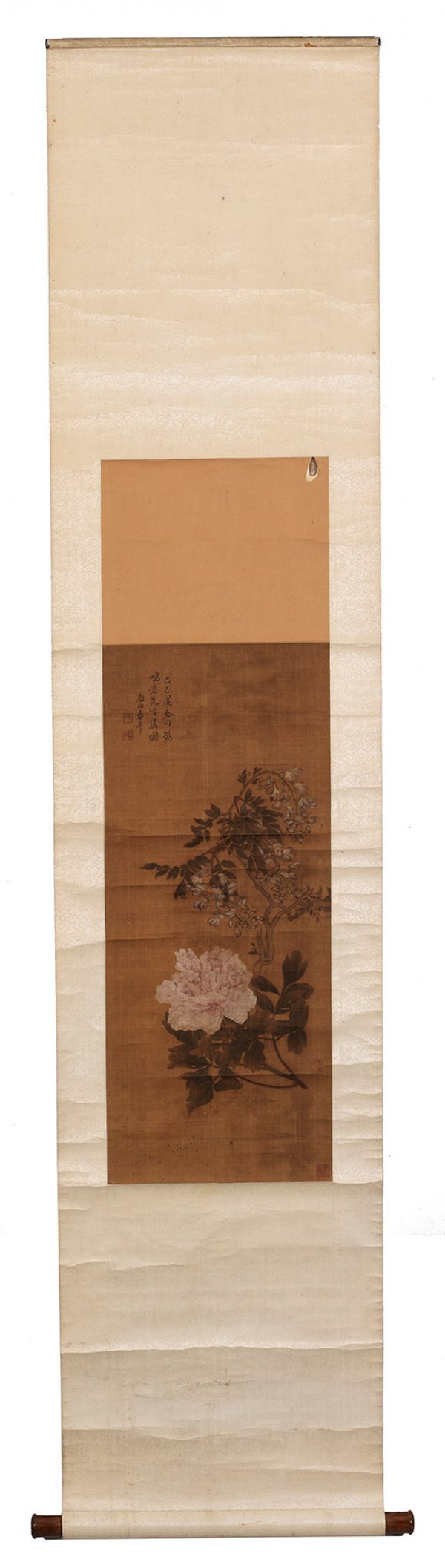 Zwei chinesische Rollbilder Flusslauf mit baumbestandenem Gebirge und Architektur mit Figurenstaffage sowie blühenden Päonien als farbige Tuschmalerei auf Seide. Oberhalb rote Siegel-Sign. und schwarze Kalligraphien. L. 160/218 cm x 53/47 cm.