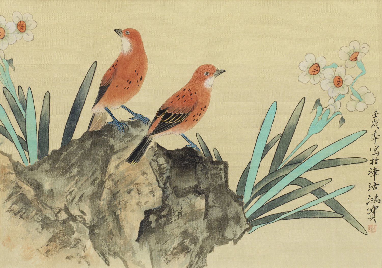 Paar chinesische Seidenmalereien Tusche und Gouache auf Seide. Virtuos gemalte Darstellung von auf einem Beerenzweig bzw. Fels sitzenden Singvögeln. Schwarze Kalligraphie und rote Siegel-Sign.; Passepartout. Rahmen 42 xm x 51 cm.