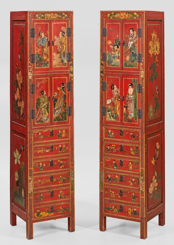 Paar chinesische Pfeilerschränke Holz flächendeckend rot lackiert sowie polychrom bemalt. Gerader hochrechteckiger seitlich kassettierter Korpus auf gekanteten Füßen. In der gegliederten Front je vier schmale Türen sowie sechs Schubladen mit verdeckter Verschlussleiste. In der Front unterschiedliche figurale Szenerien sowie seitlich Blütendekor u.a. aus Päonien und Blauregen sowie Vögeln. H. 153 cm. 35 5 cm x 36 cm.