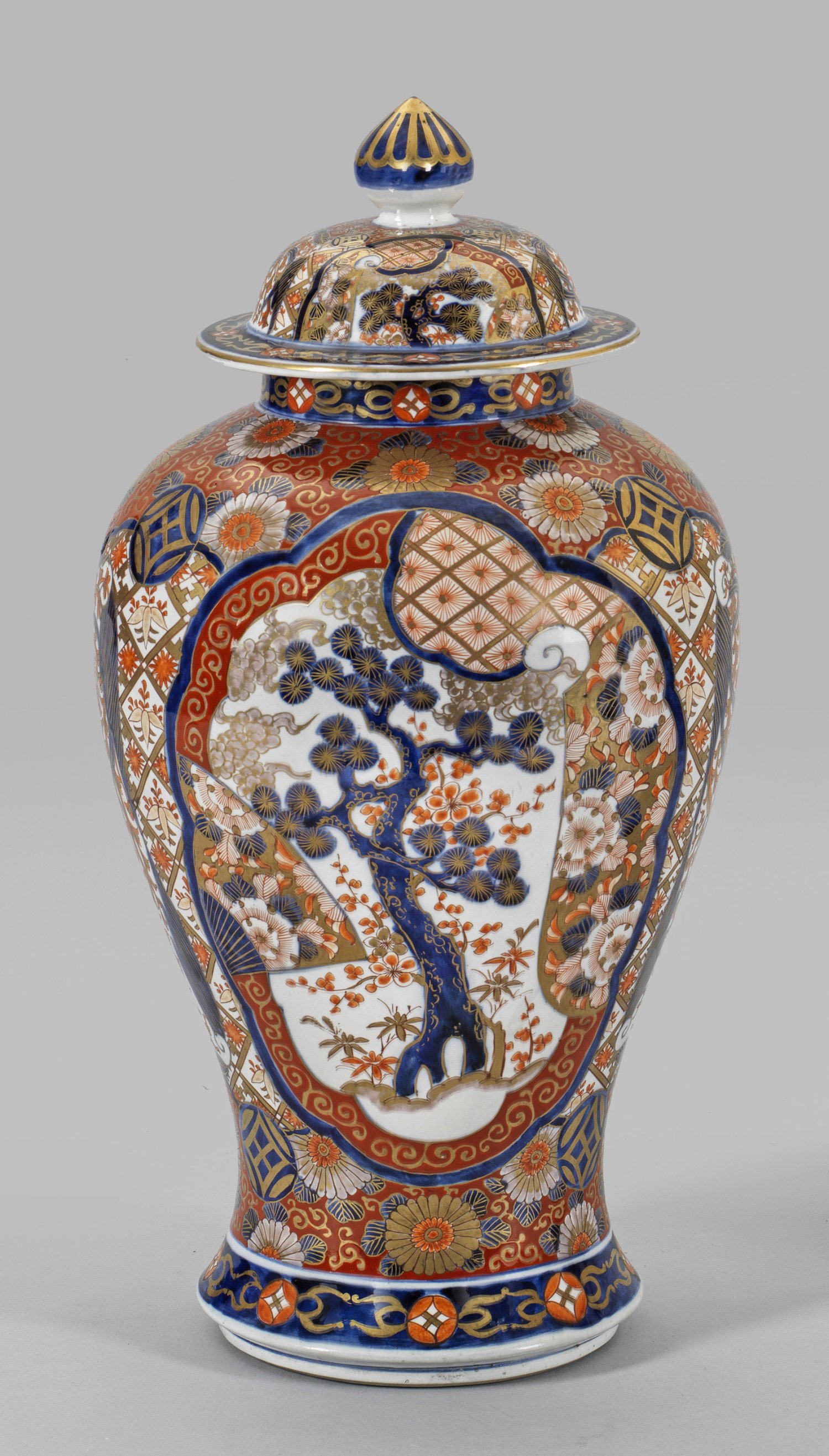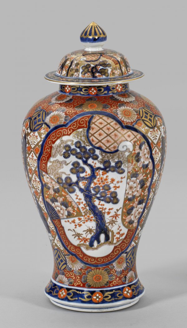 Große Imari-Balustervase mit Deckel. Porzellan. Beidseitig der Wandung passige Reserven mit Pinien- und Prunusbaum begrenzt von Brokatmustern stilisierten Vögeln zwischen Rankenwerk Münzsymbolen sowie breiten Fondflächen mit blühenden Chrysanthemen und Päonien. Unterglasurblaue sowie eisenrote Email- und Goldmalerei. Produktionsmakel. Im Boden eisenrotes Zeichen in Aufglasur. H. 65 cm.