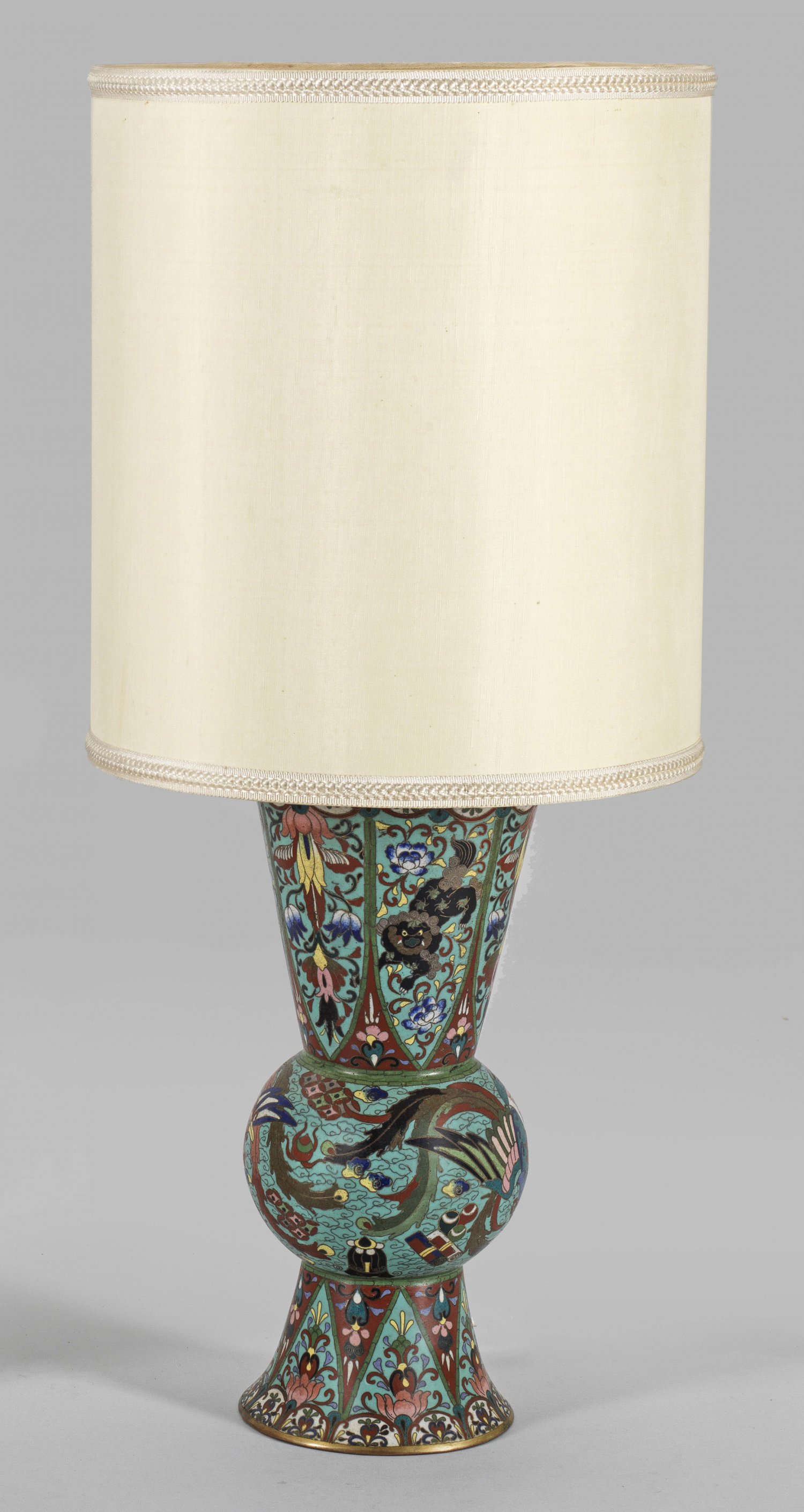 Cloisonné-Vase als Tischleuchte 1-flg.; Gu-Form. Kupfer, polychromes Email-Cloisonné. Auf der Wandung flächendeckender Dekor aus Fenghuang-Vögeln und Bildrollen zwischen stilisierten Wolken, Lanzettreserven mit Lotus, Päonien, Fo-Hunden und dreiklauigem Drachen. Umlaufend breite, florale Bordüren. Im Boden Vierzeichenmarke. Zylindrischer Textilschirm. Beschwert. Elektrifiziert. Ges.-H. 68 cm.