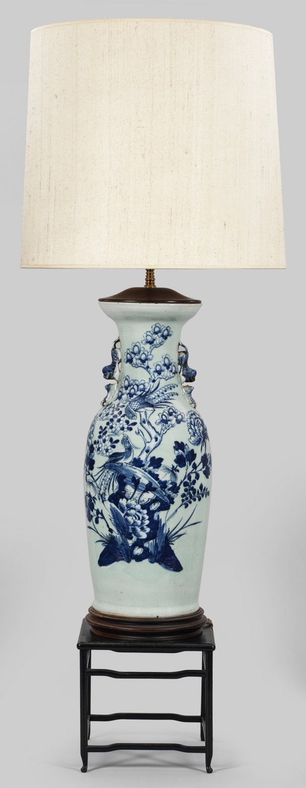 Chinesische Balustervase mit Blauweiß-Dekor als Tischleuchte 2-flg.; Porzellan, seladonfarben glasiert. Auf profiliertem Holzsockel balusterförmiger Korpus, seitlich plastische Henkel in Gestalt von Qilong-Drachen. Auf der Schauseite über Fels aufsteigender, kräftiger, sich verzweigender Päonienast mit Fenghuang-Vögeln sowie Prunuszweige in unterglasurblauer Malerei. Konischer Textilschirm. Elektrifiziert. Montierung später. Ges.-H. 116 cm. Beigabe: kleiner Holzhocker.