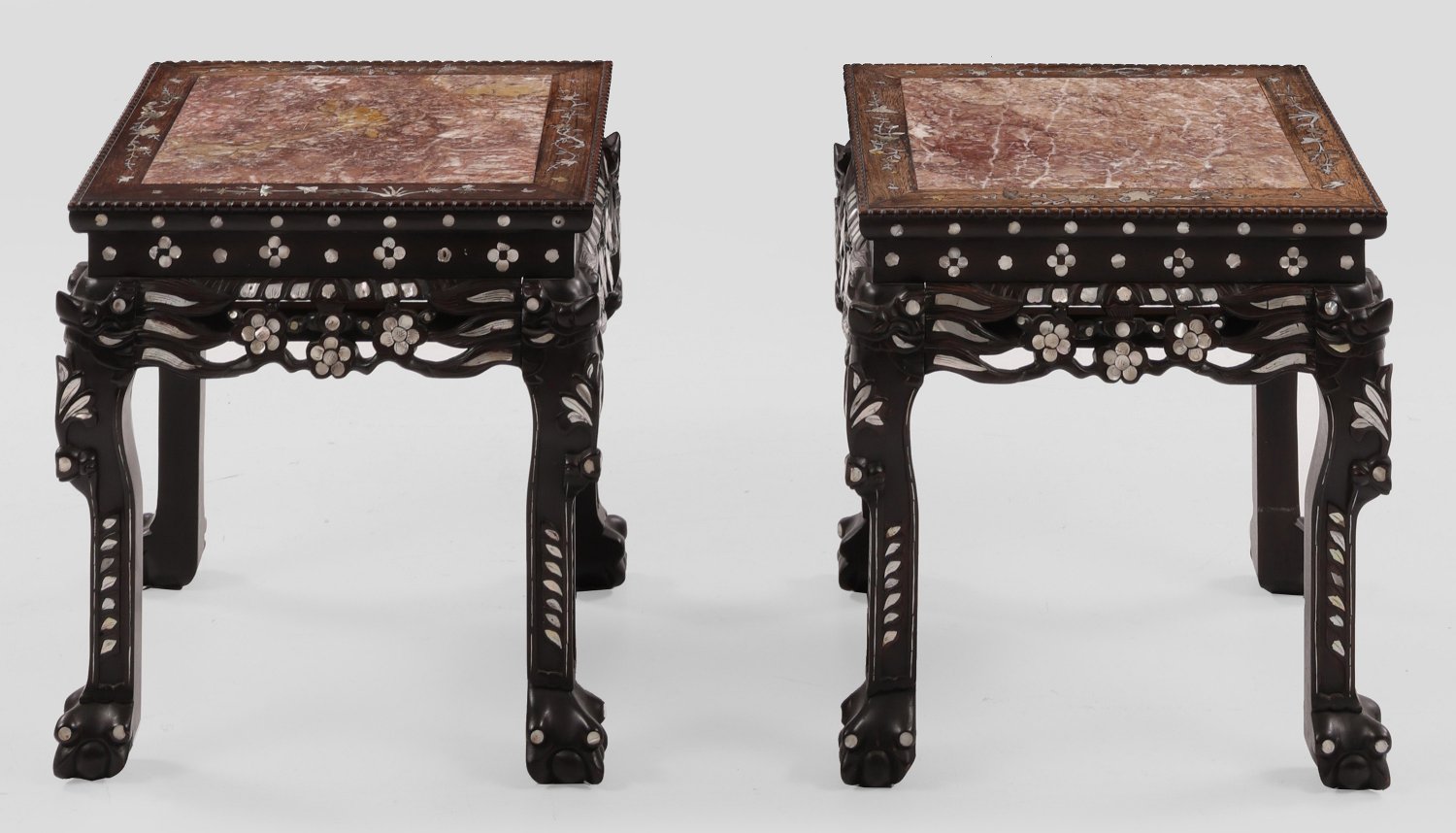 Paar chinesische Beistelltische Palisander dunkel gebeizt sowie Einlagen aus Perlmutt sowie rotgemaserter Marmor. Durchbrochen gearbeitete Zarge aus Blüten auf leicht geschweiften Beinen aus stilisierten Drachen. Gering überstehende profilierte Deckplatte. H. 46 cm. 42 cm x 42 cm.