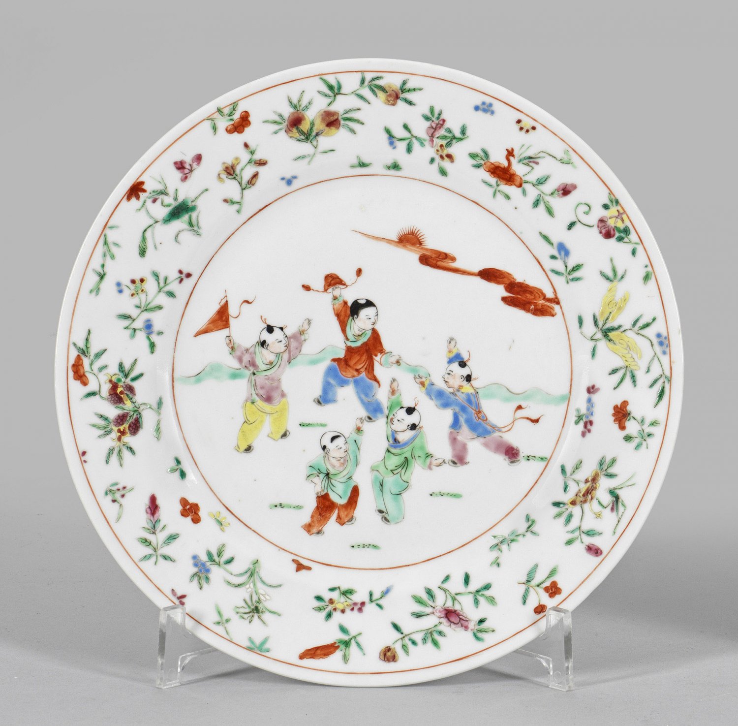 "Famille rose"-Teller Porzellan. Im Spiegel szenische Darstellungen von spielenden Kindern, auf der ansteigenden Fahne asiatische Blüten sowie Granatäpfel- und Pfirsichfrüchte-Dekor in sehr feiner polychromer Malerei. Im Boden eisenrote Dao Guang-Siegelmarke. D. 24,5 cm.