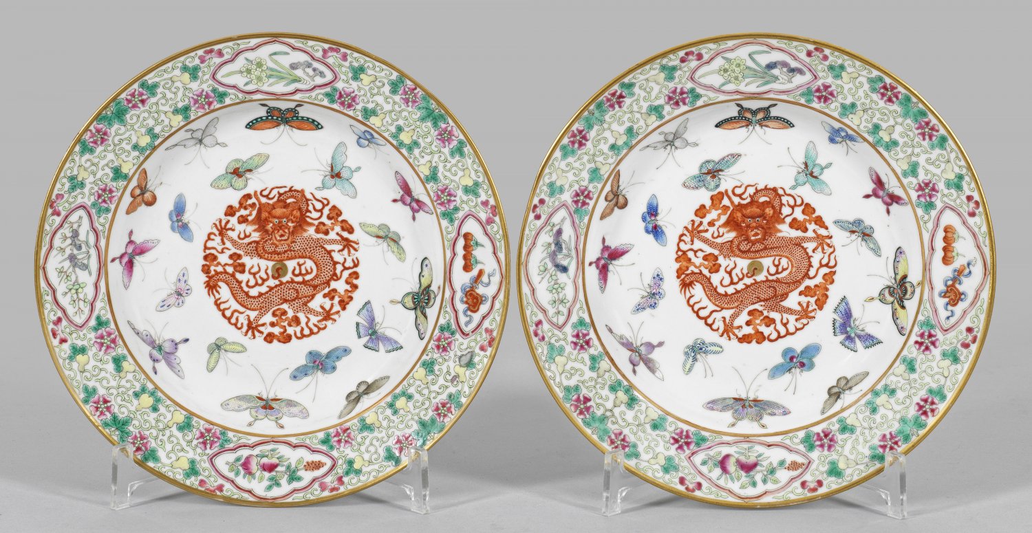 Paar "Famille rose"-Teller mit Drachendekor Porzellan. Im vertieften Spiegel fünfklauiger Drache mit Glücksperle, umrahmt von fliegenden Schmetterlingen, auf der Fahne vierpassige Reserven mit Pfirsichfrüchten und weiteren Glückssymbolen zwischen Lotusranken in sehr feiner polychromer Emailmalerei. Im Boden rote Zehn-Zeichen-Marke. D. 23 cm.