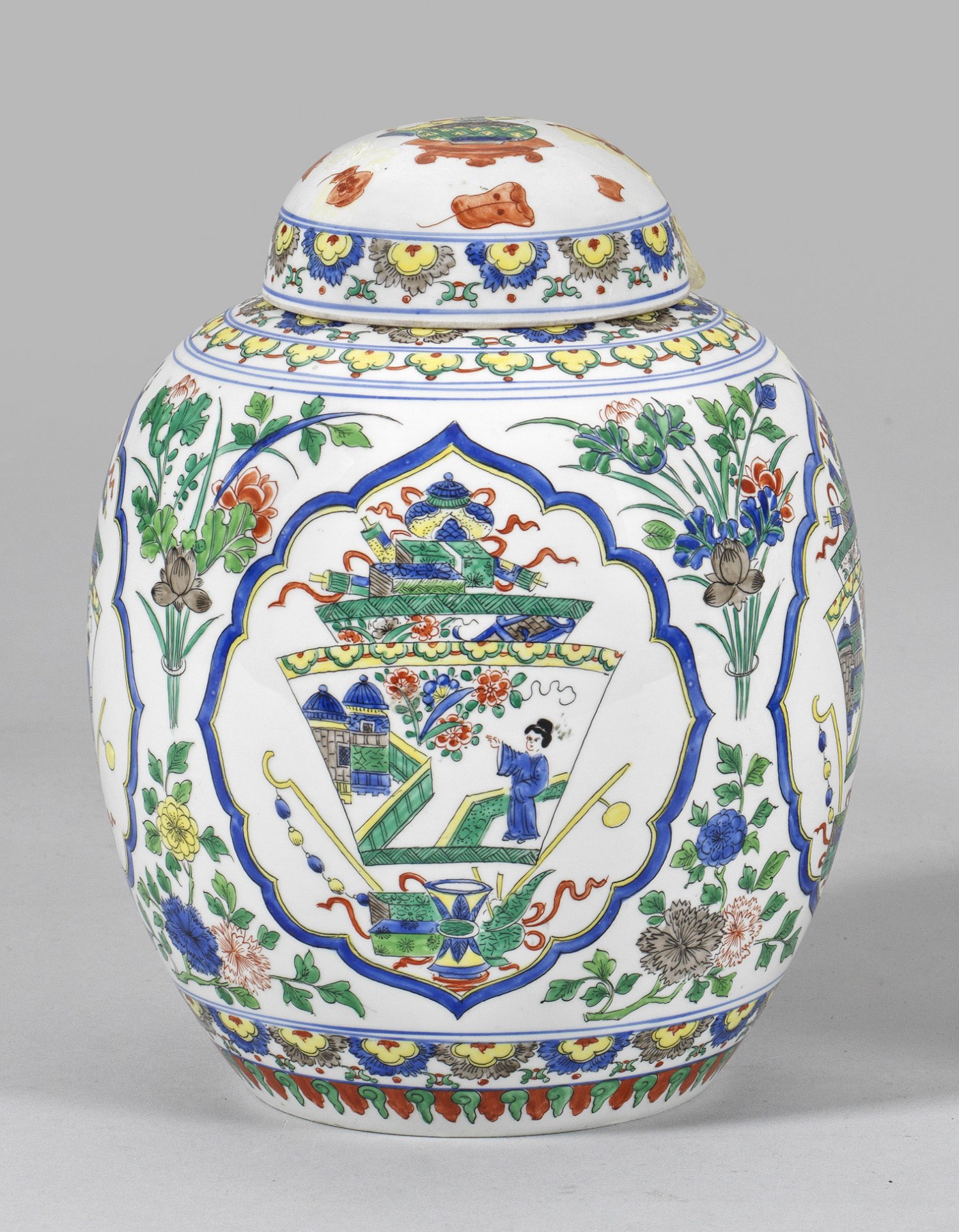 Ingwergefäß "Famille verte" Porzellan. Flächendeckender Dekor aus vierpassigen Reserven, darin stilisierte Landschaften mit Architektur und buddhistischen Glückssymbolen, begrenzt von üppigen Lotus- und Chrysanthemenblüten in äußerst feiner polychromer Emailmalerei. Bordüren aus Ruyimotiven. H.22,5 cm.