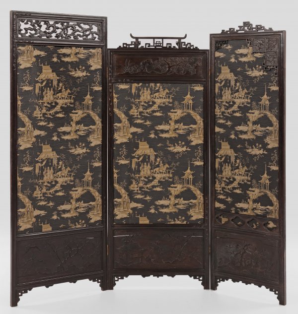Großer Paravent 3-tlg.; Holz, dunkel gebeizt. Unterschiedlich große Paneele schauseitig mit schmaler Profilrahmung, floral durchbrochen gearbeiteten oberen Abschlüssen sowie breiten Reserven mit unterschiedlichen Landschaftsdarstellungen. In der Mitte Papierbespannung mit im Rapport angelegten, silberfarbenen Chinoiserien auf schwarzem Fond. Paneele: 190 x 59 cm, 182 cm x 73 cm sowie 194 cm x 73 cm.