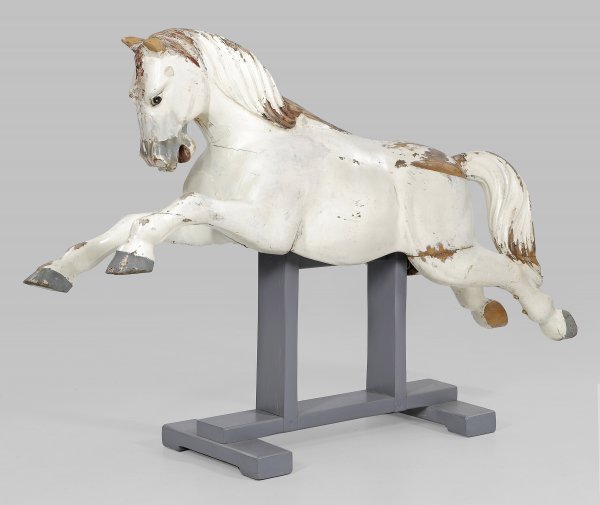 Großes Karussellpferd Holz geschnitzt und gefasst. Vollplastische Darstellung eines galoppierenden Pferdes auf gekanteten Stützen. Altersspuren und kleinere Ergänzungen. H. 118 cm. L. 170 cm.