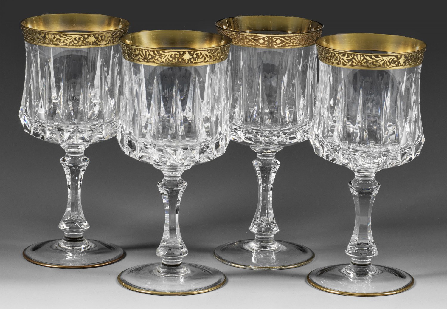 Farbloses Kristallglas, geschliffen. Flacher Scheibenfuß, Schaft sechsfach facettiert, auf der Kuppa umlaufender Schliff-Fries, Lippenrand mit vergoldetem, geätztem Friesband. H. 16,8 cm.