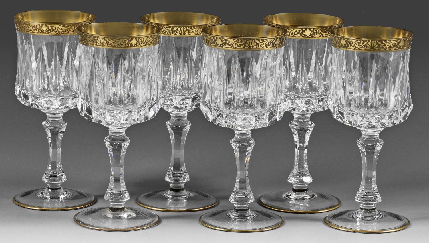 At set of six Czechoslovakian Moser cut crystal wine glasses with acid-etched and gilt rims.
