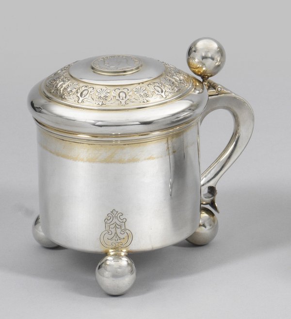 Silber, teilw. vergoldet. Von Kugelfüßen getragener, zylindrischer Korpus. Scharnierdeckel mittig besetzt mit einer schwedischen Münze, gerahmt von reliefiertem Ornamentband mit Voluten- und Blattdekor. Seitlicher, breiter Ohrenhenkel mit einer Kugel als Daumenrast. Innen vergoldet. Gest., Beschau-, Stadtmarke, Jahresbuchstabe "X 7", Herstellerzeichen. Gew. ca. 370 g. H. 13,5 cm.