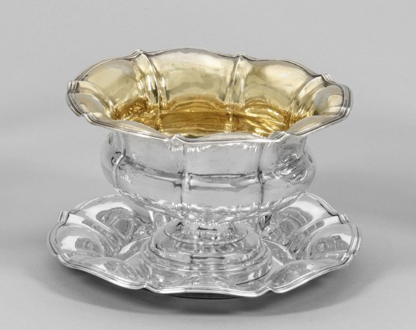 Silber. Runder Teller mit breiter, passig geschweifter Fahne. Darüber ein kurzer, trompetenförmiger Schaft, übergehend in bauchige Schale mit blütenförmig ausschwingendem, mehrfach profiliertem Rand. Wandung und breiter Stand gegliedert durch passig geschweifte Züge. Innen vergoldet. Gest., Beschauzeichen, Stadtmarke, Meister Carl Olof Holm (tätig ab 1841) . Gew. ca. 420 g. H. 12 cm. D. 20 cm bzw. 18,5 cm.
