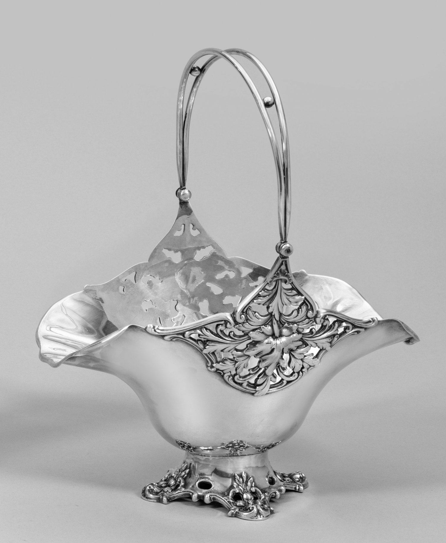 Silber. Über durchbrochen gearbeitetem, aus Voluten und Blüten gestaltetem, vierfach eingezogenem Stand ein tief gemuldeter Korpus. Die Ränder außen gezogen bzw. in korrespondierender Durchbrucharbeit aus Akanthusblättern endend. Aus zwei gebogten Streben bestehender, übergreifender und beweglicher Henkel. Gest. 875. Importmarke, Beschaumeister Aleksandr Romanov, Herstellerzeichen. Gew. ca. 665 g. H. 34 cm. 26 cm x 18 cm.