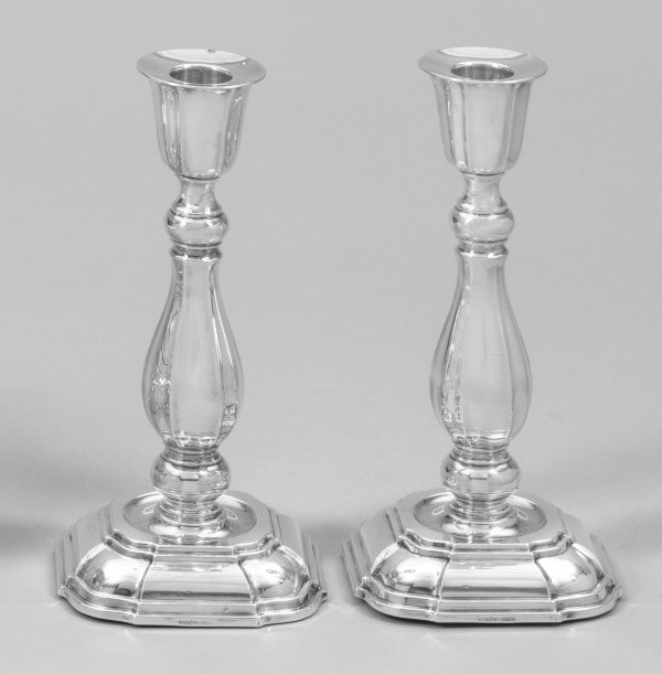 Silber, beschwert. Nahezu quadratischer, mehrfach profilierter Stand mit gerundeten Ecken. Balusterförmiger, konischer Schaft, übergehend in korrespondierende Tülle. Gest., Stadtmarke, Jahresmarke "E 10", Herstellerzeichen. Gew. zus. ca. 690 g. H. 19,5 cm.