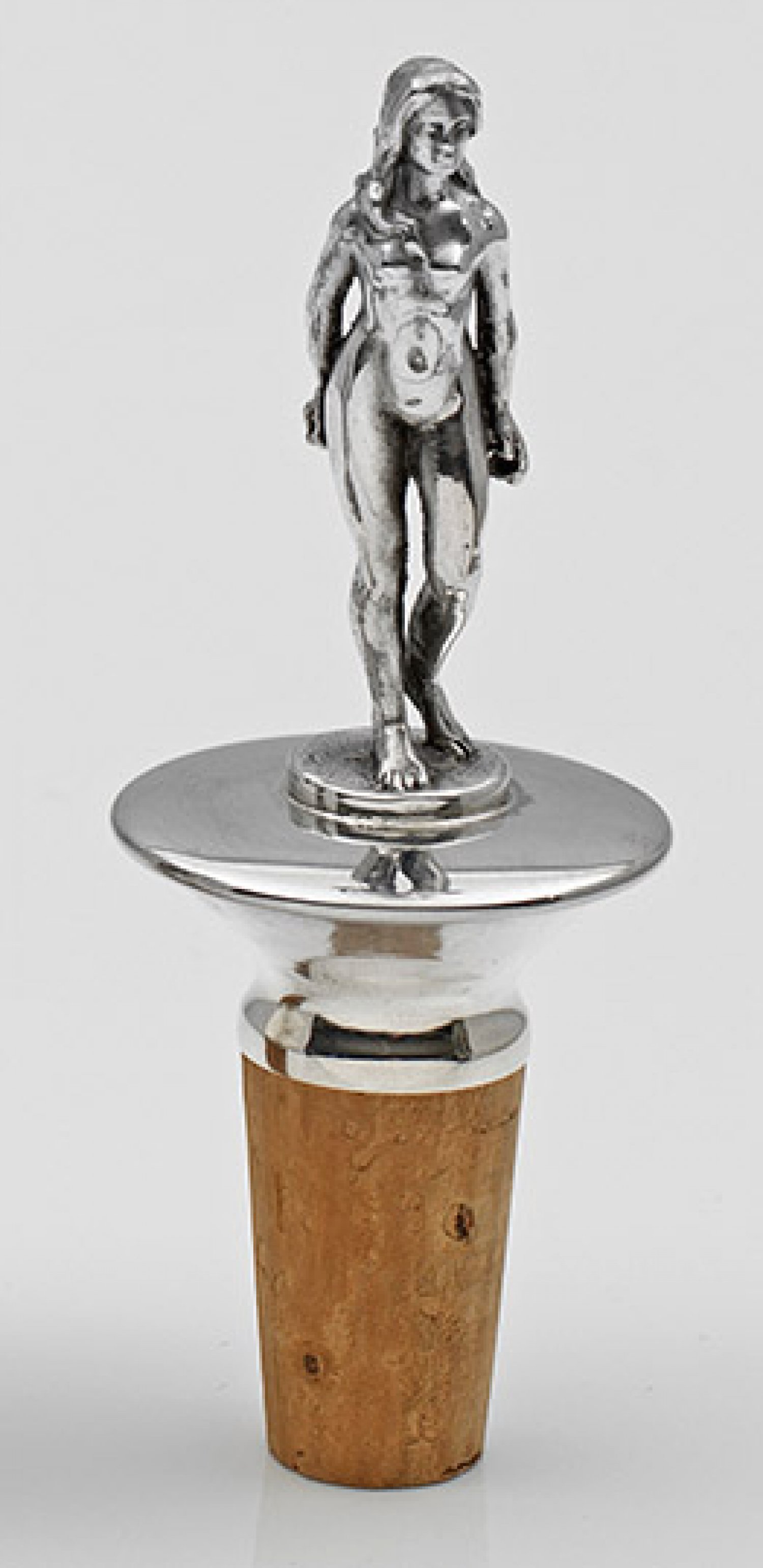 A Sterling silver mounted bottle cork with Eve, holding the apple in her hand. Standard mark 925.